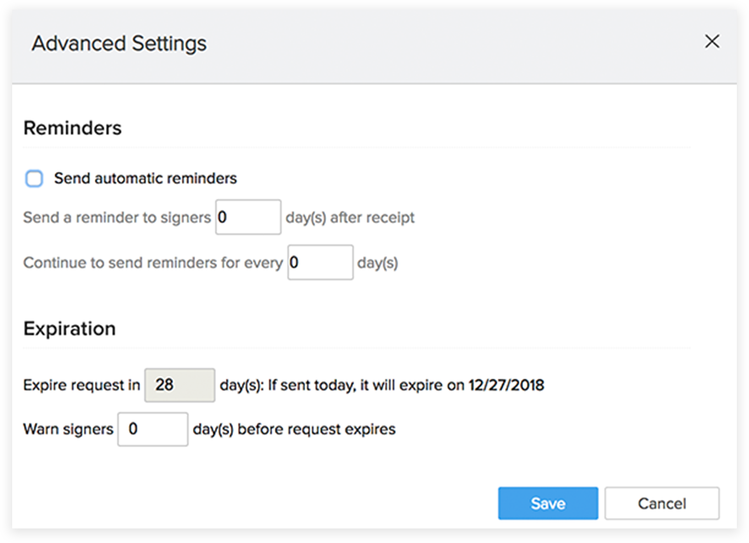 - 詳細設定を編集するには「編集」をクリックし、自動リマインダーや有効期限の日付を設定します。「保存」をクリックします。