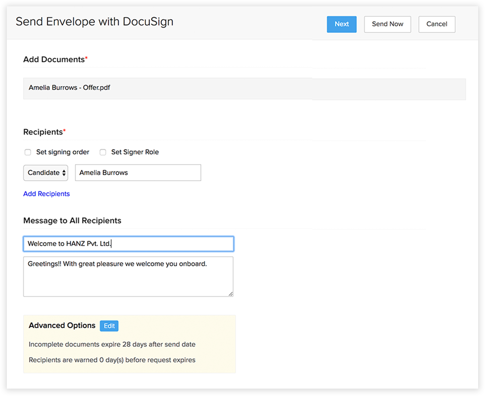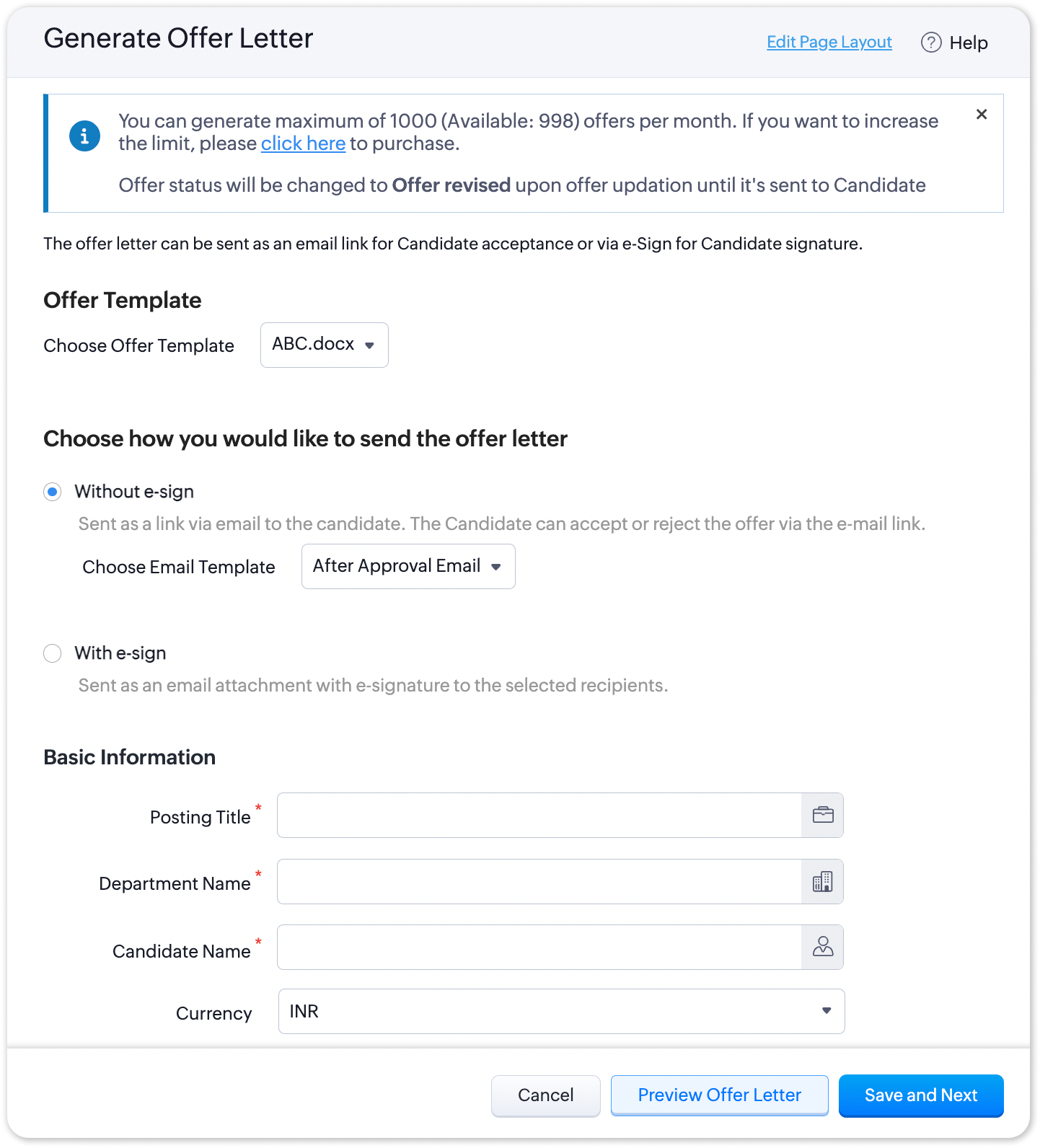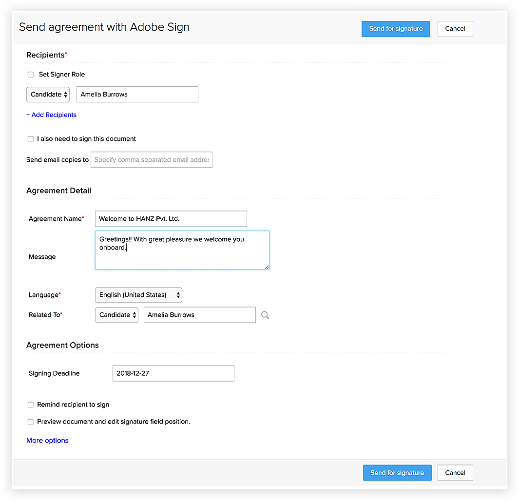 - メールテンプレートを選択し、送信する Offer Letterポップアップでその他の詳細を入力します。