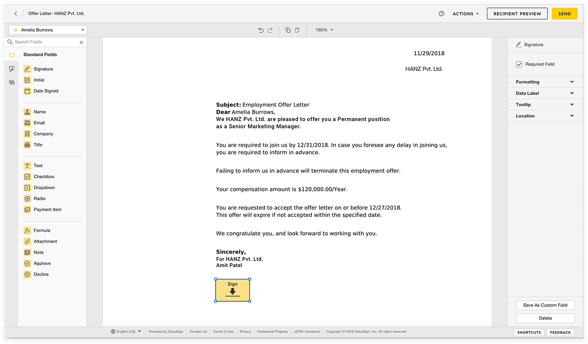 - オファーレターに必要な項目(例:署名、Sign日付)を追加します。