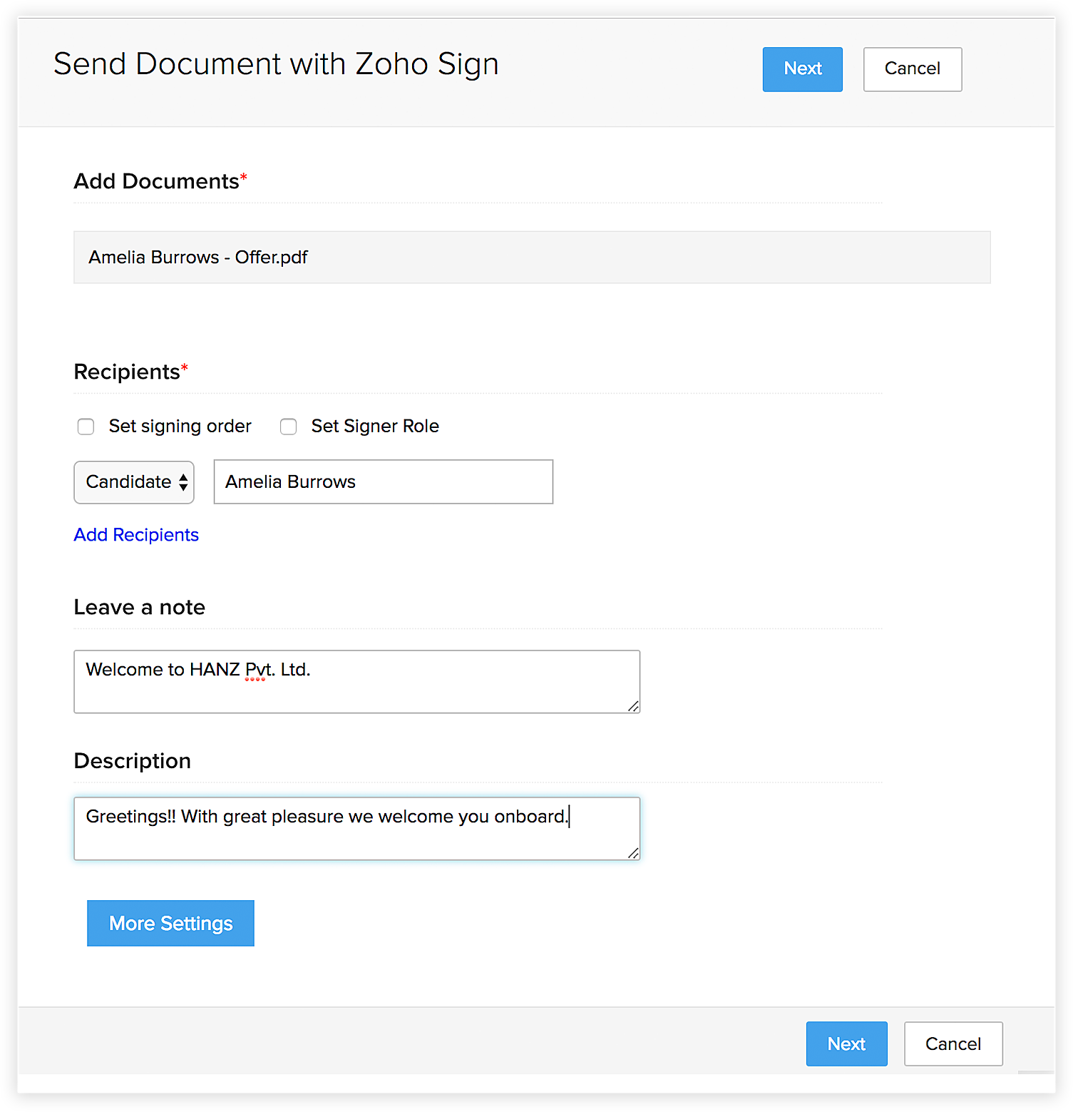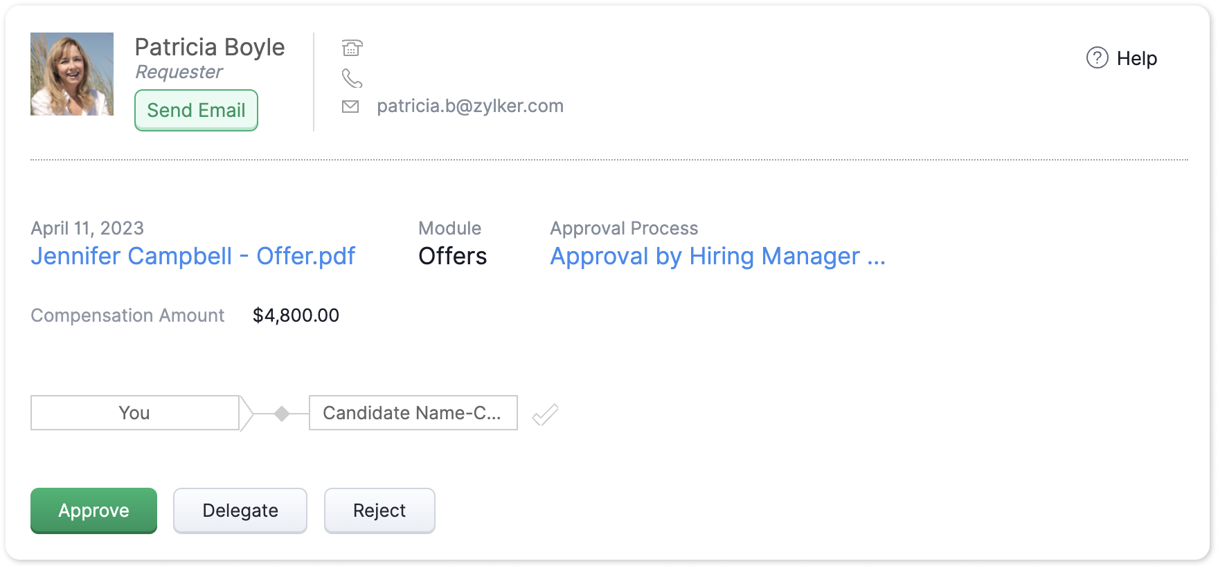 次に、候補者にオファーレターを送信するタイミングです。Zoho Recruit を使えば、オファーレターを数分で簡単に作成できます。