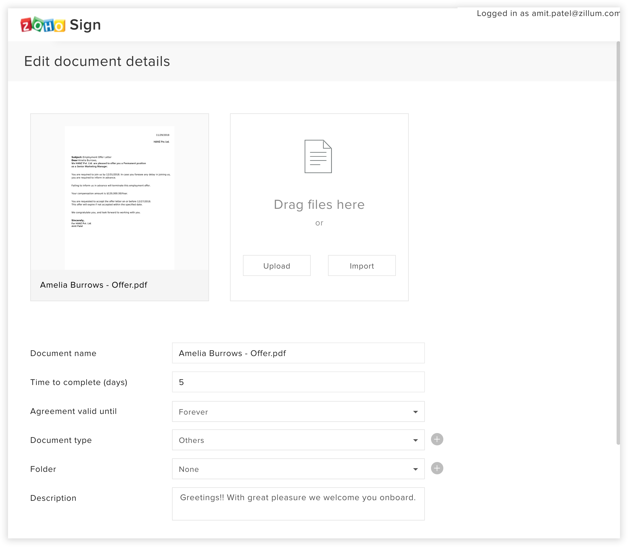 - 必要な項目(例:署名、署名日)をオファーレターに追加します。