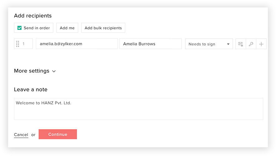 - recipientsを追加し、必須の合意内容詳細を入力します。必要に応じて合意設定も入力できます。