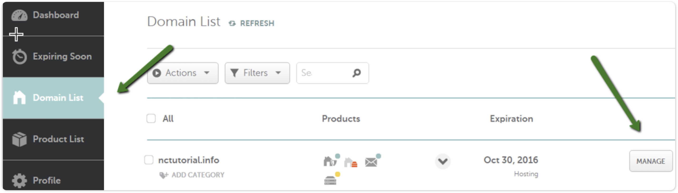 2. 左側のサイドバーから ドメインリスト を選択し、ドメインの横にある 管理 をクリックします。