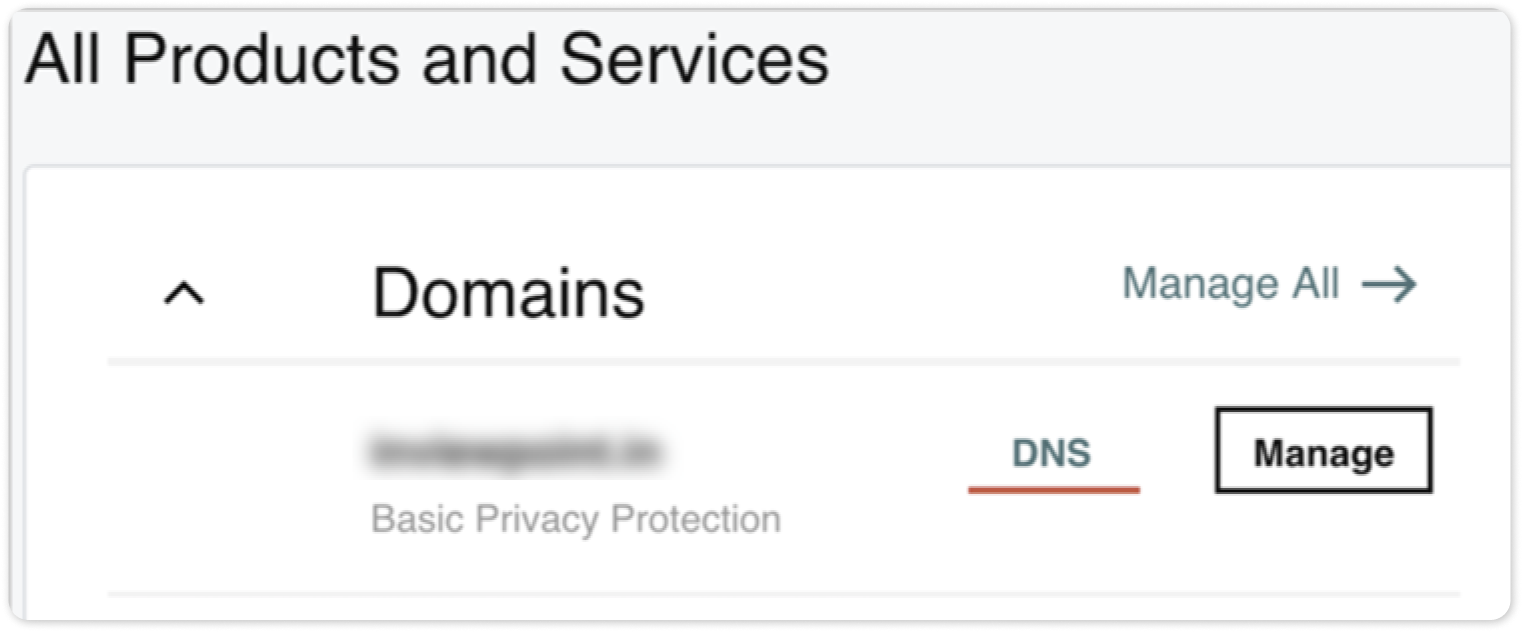 3. ドメインを展開し、認証するドメインのDNSを管理ボタンをクリックします。その後、DNSマネージャーページにリダイレクトされ、既存のDNSデータの情報を表示できます。