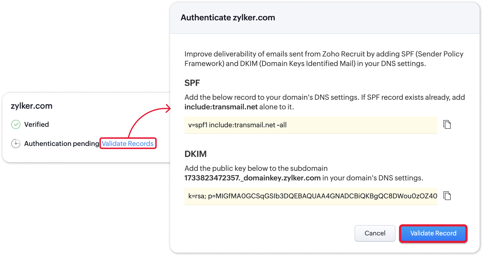 この認証プロセスはZoho Recruit内でも行うことができ、それが完了した後、自動的に生成されたSPFおよびDKIMデータをドメインマネージャーに追加する必要があります。