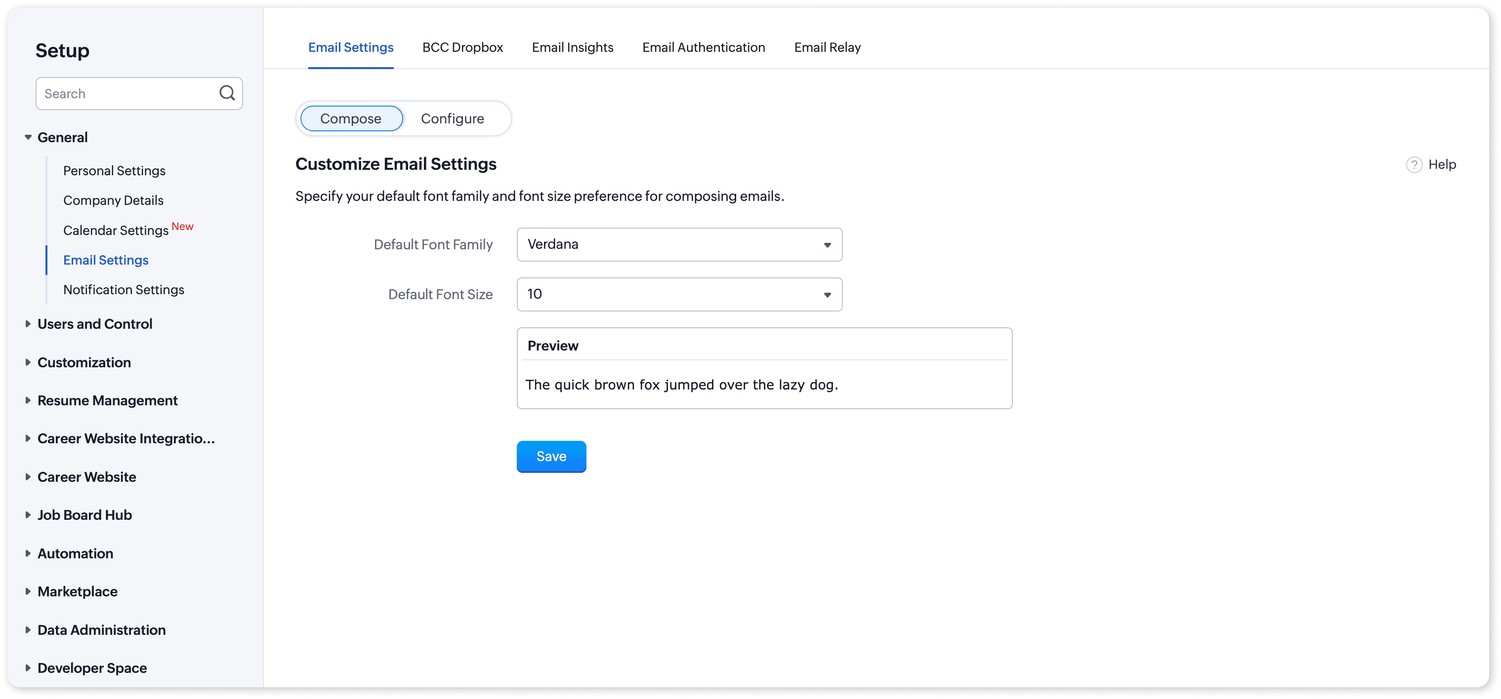 1. 標準化されたメール:初期設定のフォントファミリーおよびサイズを定義し、Zoho Recruitから送信されるすべてのメールで一貫性を確保します。