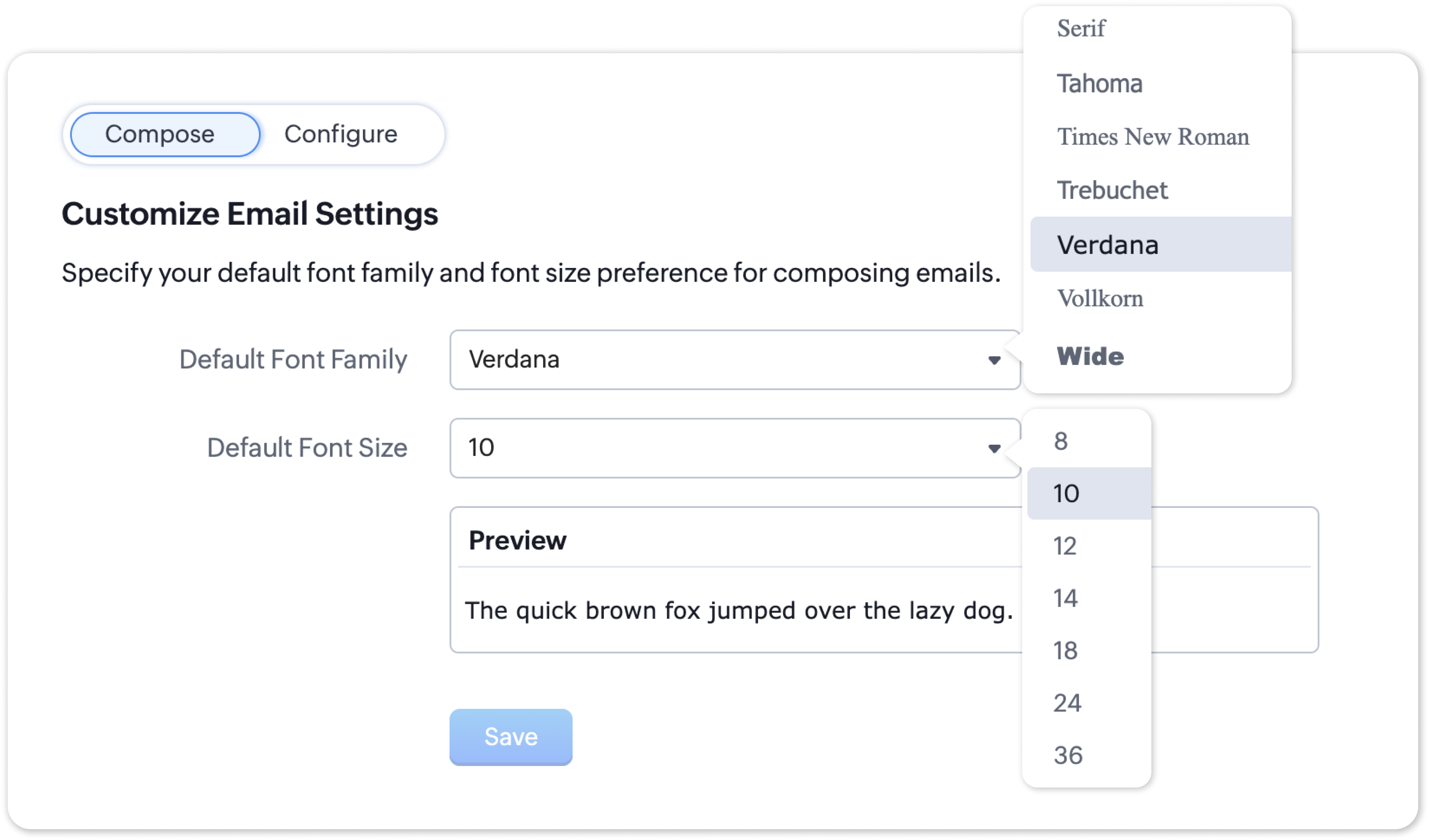 利用可能な設定から、デフォルトのフォント種類およびサイズを選択できます。このフォントは、Zoho Recruitのメールを送信する新しく作成するメールテンプレート機能で作成されるすべてのメールに自動的に適用されます。