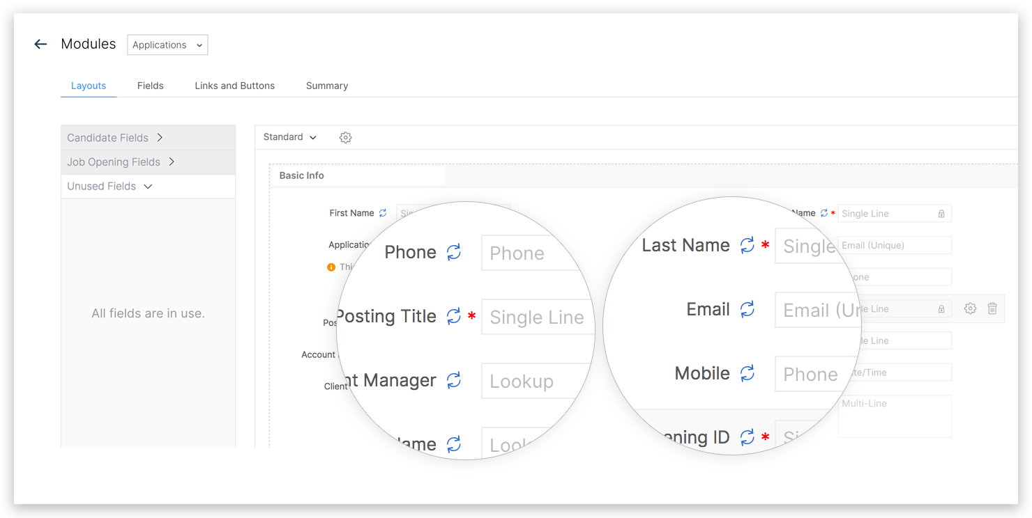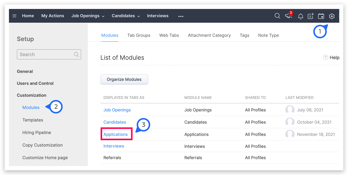 Zoho Recruitのアプリケーションモジュールを使用すると、各求人オープンに対する候補者応募を追跡することができます。 Recruitで他のモジュールをカスタマイズするのと同様に、アプリケーションモジュールのフィールドとレイアウトをカスタマイズすることができます。
