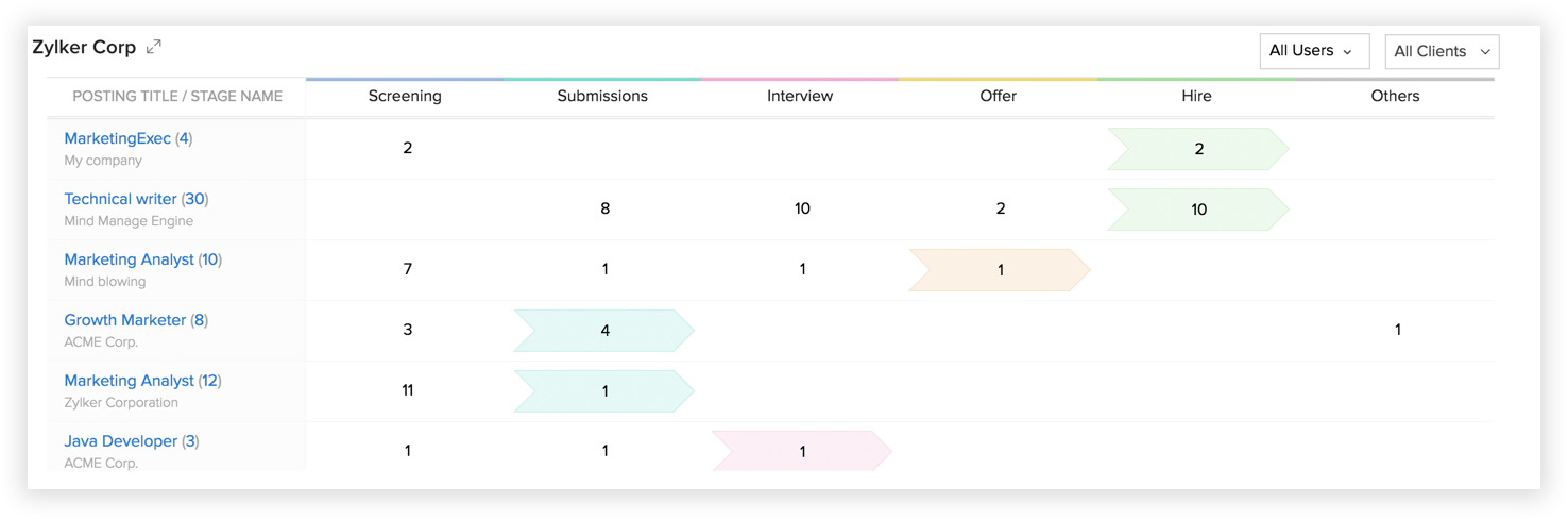 Zoho Recruitは、求人空缺とそれに対応する採用パイプラインの一元的な表示を提供します。これはダッシュボードからアクセスできます。