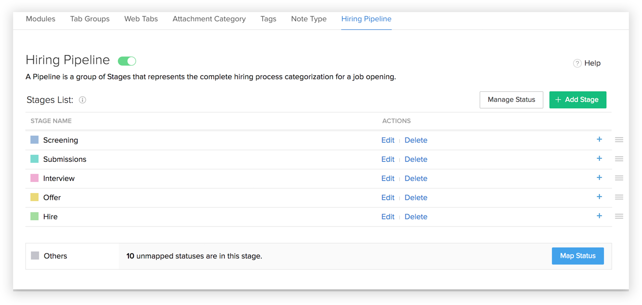 Zoho RecruitのHiring Pipelineは、採用プロセスの各段階を表しています。特定の求人票に関連づけられた候補者が一度結びついた後に従う手順は組織により異なるかもしれませんが、当社の初期設定 Hiring Pipelineは次のように表示されます:
