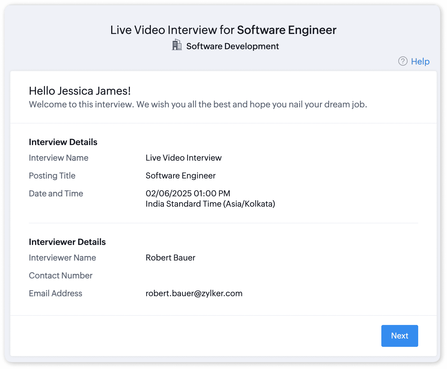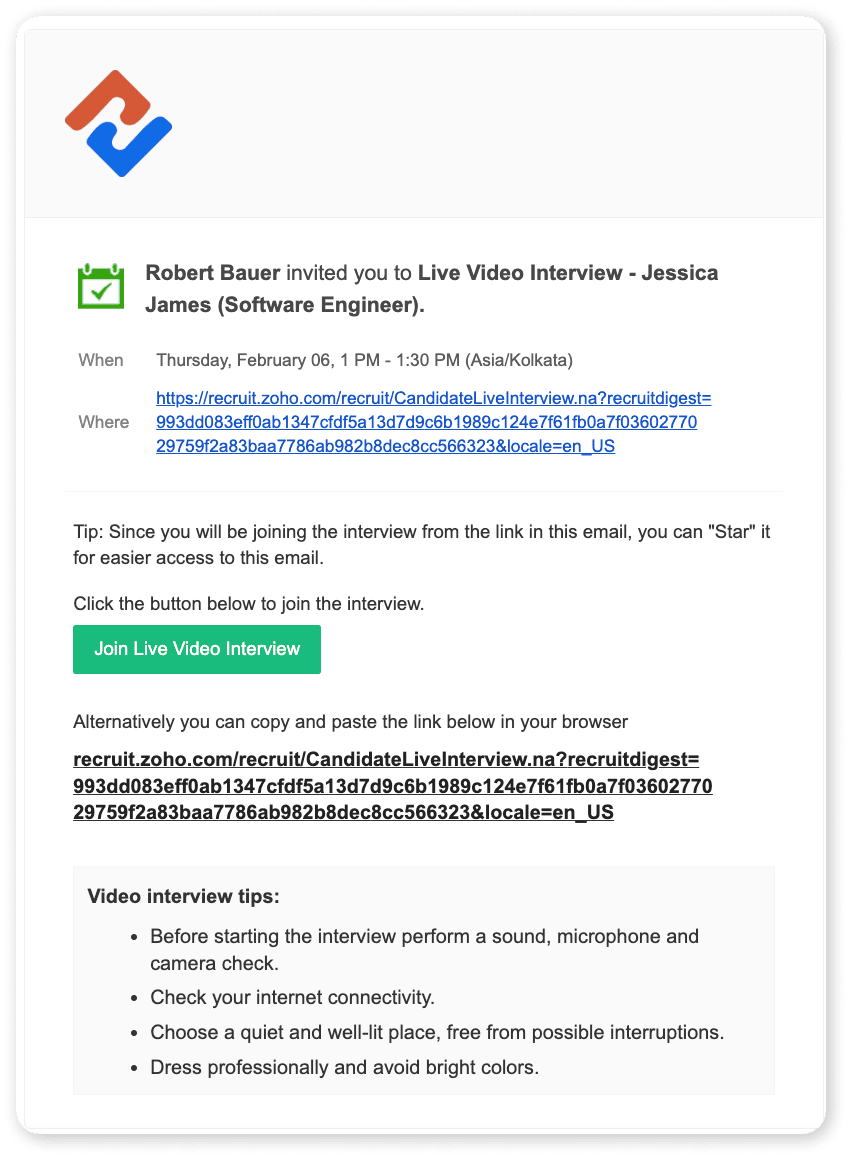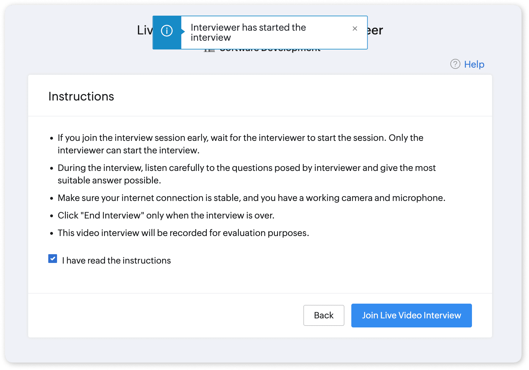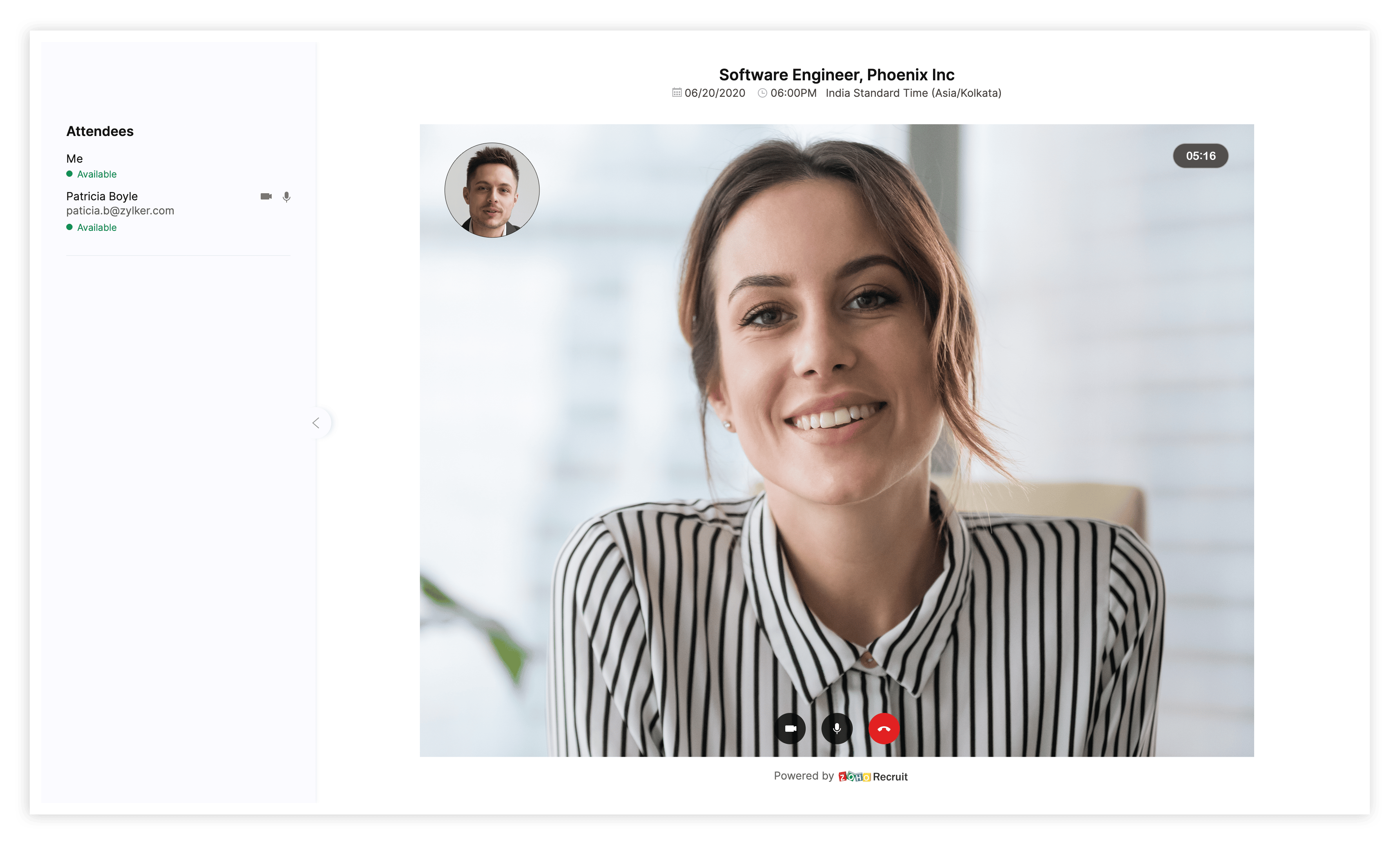 画面の左側で、候補者と面接官の両方のステータスを表示できます。ミュートやビデオ一時停止の設定は、インタビューウィンドウ内で利用できます。