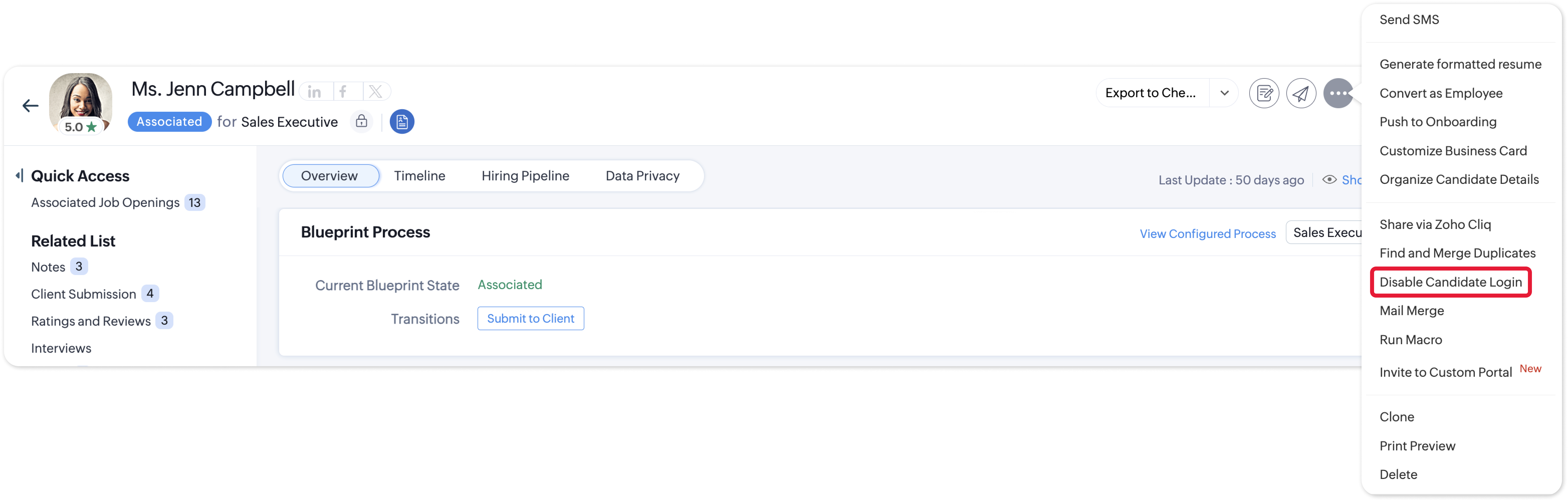 差出人が各自のポータル アカウントにログインするのを阻止します。その他の操作 > 候補者ログインを無効にする を経由して。