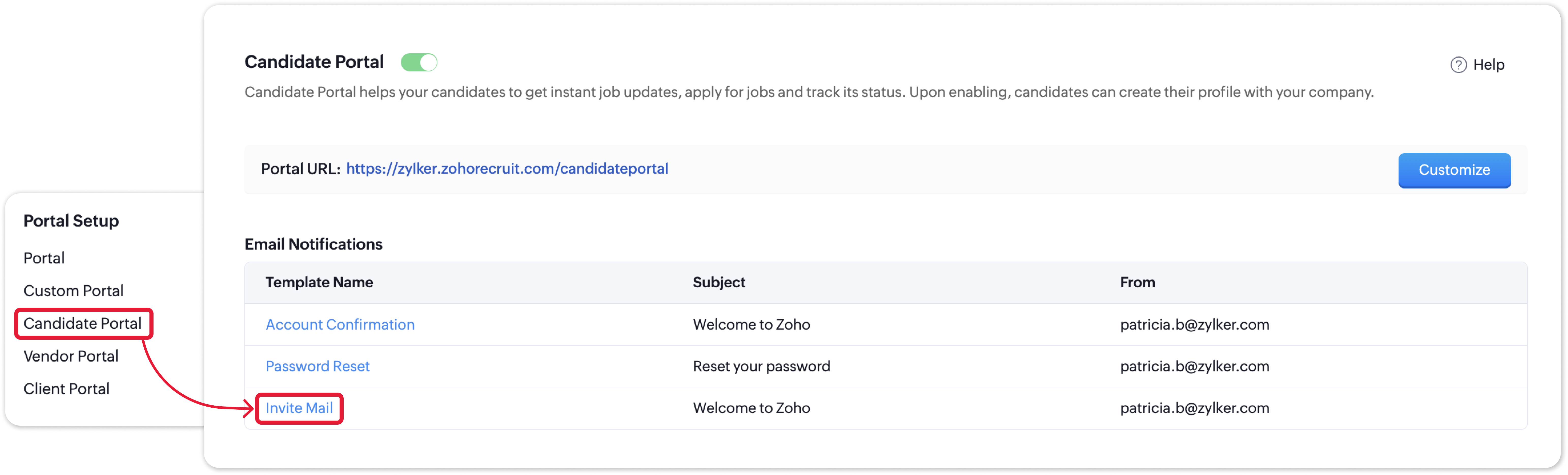 2. この招待状の差出人でメールテンプレートをカスタマイズするオプションがあります。設定 > ポータル設定 > 候補者ポータルでクリックします。 招待メールテンプレートはメール通知セクションの下にあります。