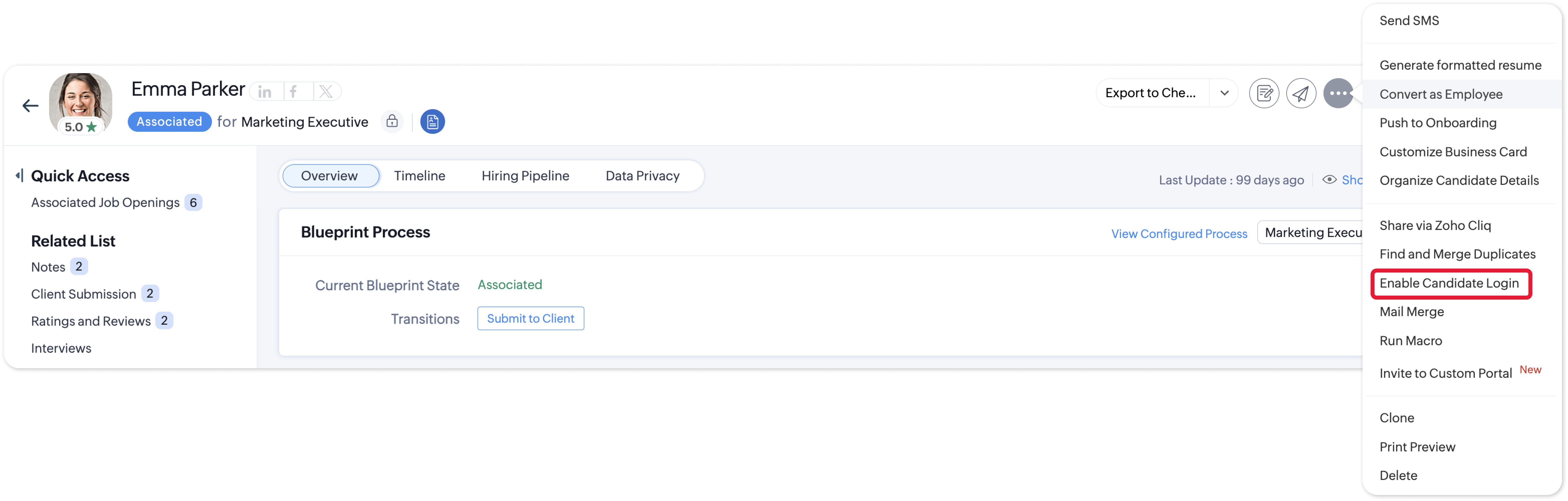 Zoho Recruitでは、一括で候補者にポータルの招待を送信することができます。これにより大規模な才能プールの追加・管理が簡単になります。