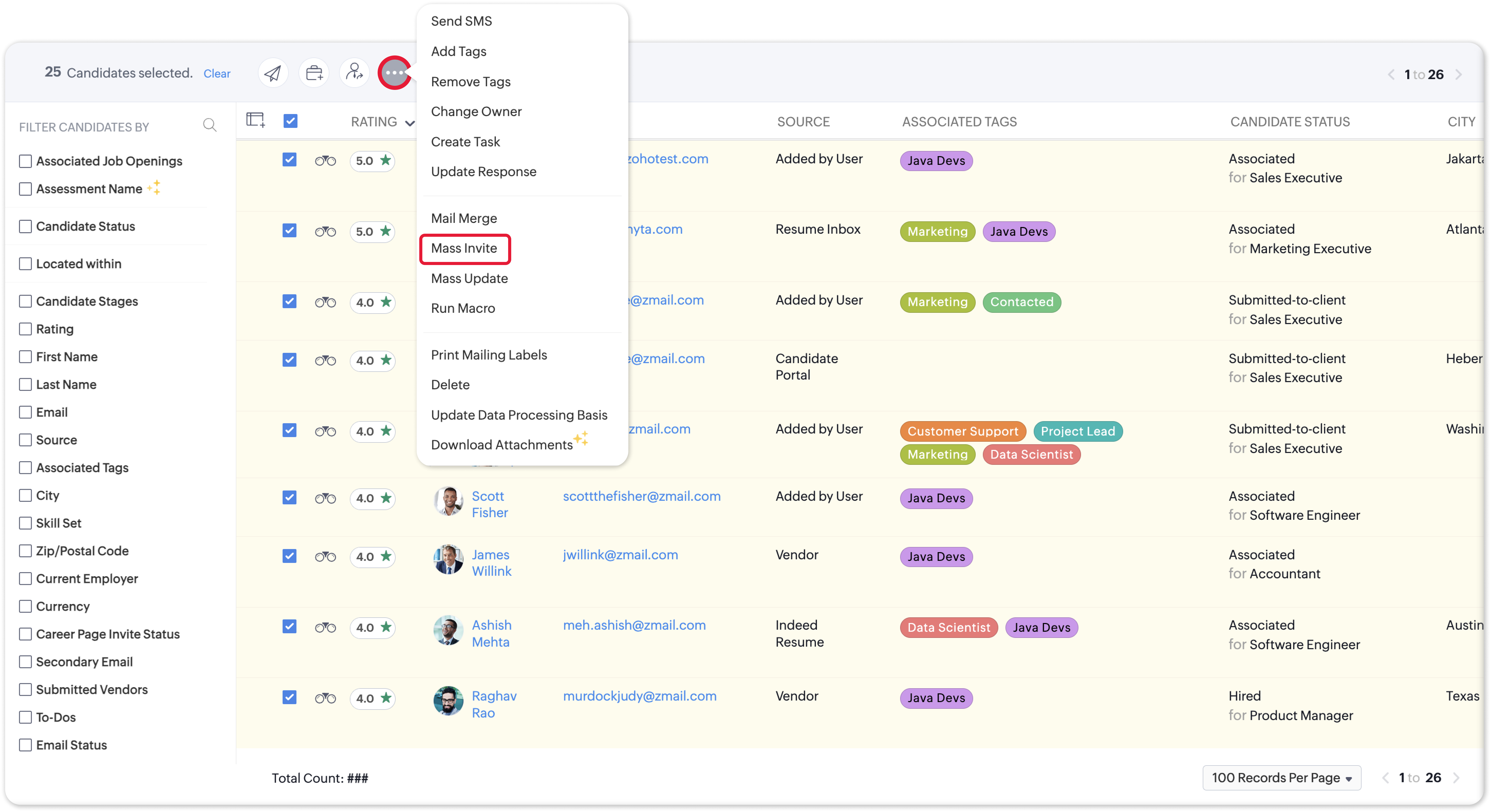 1. Candidatesタブで、招待したい候補者のデータを選択します。 その他の操作 > Mass Inviteをクリックします。その後、選択した候補者のメールアドレスに招待が送信されます。