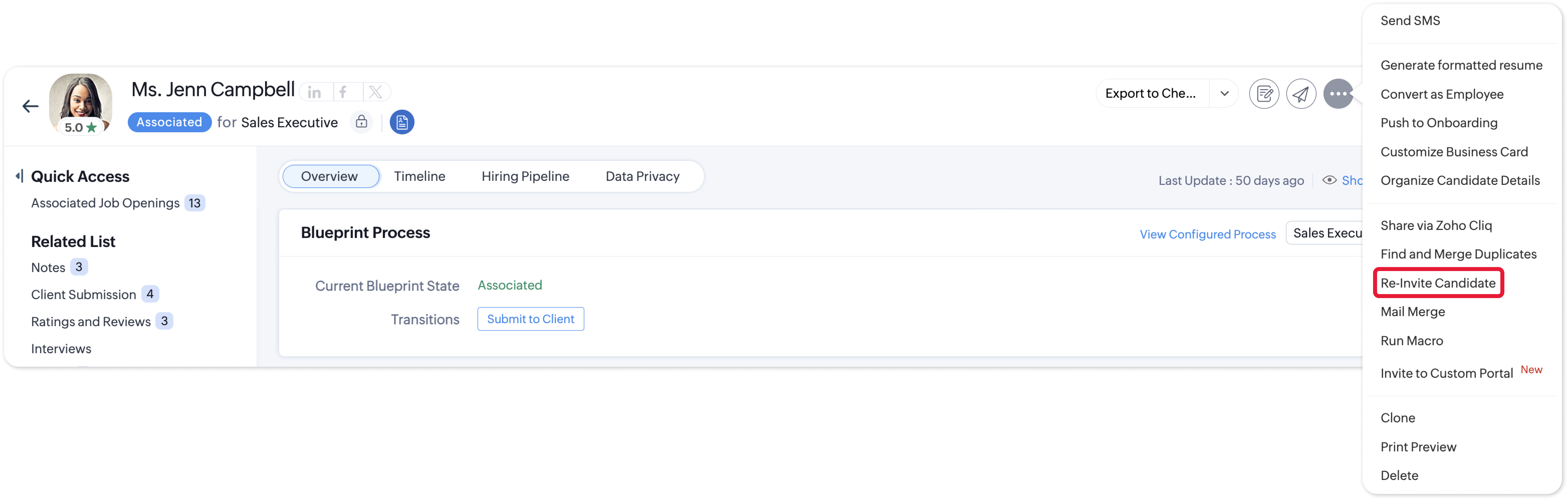 候補者に招待状を送信した後、Candidatesタブ内の候補者のデータから再度招待するオプションがあります。