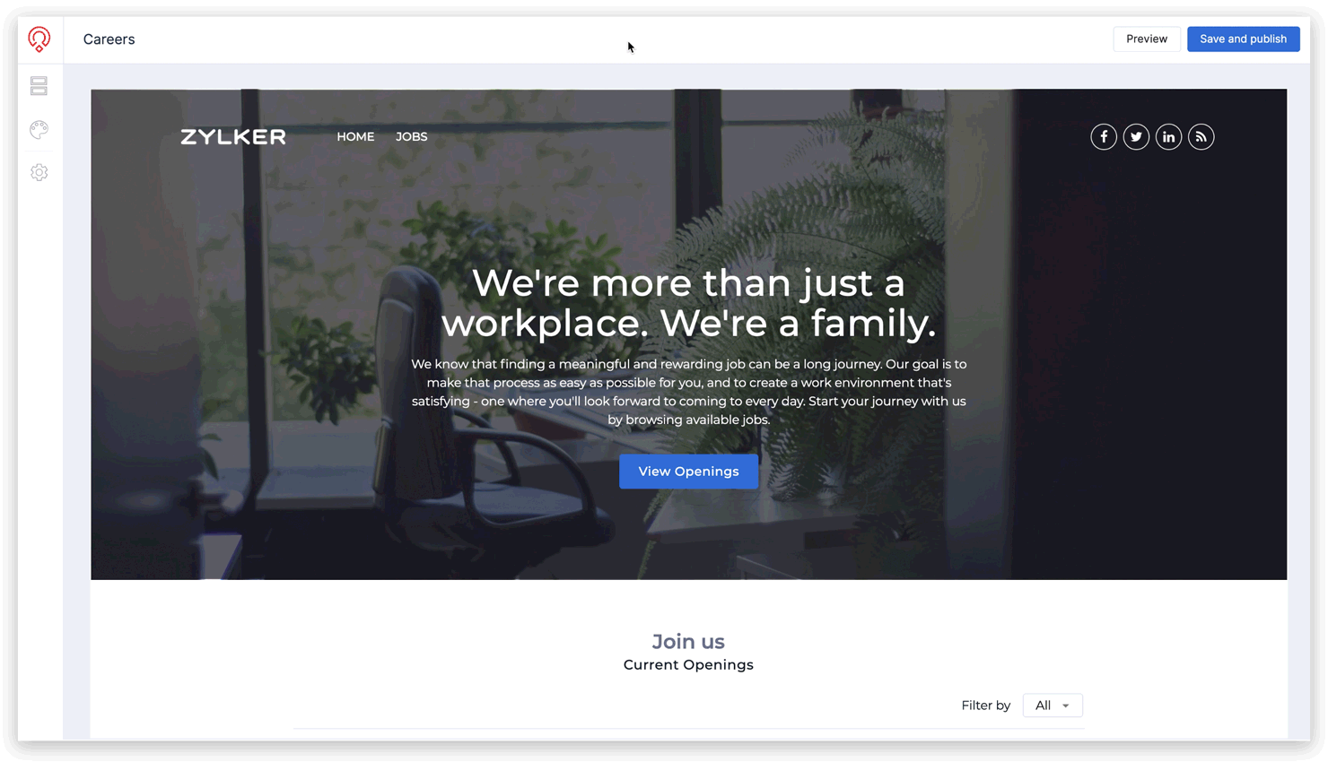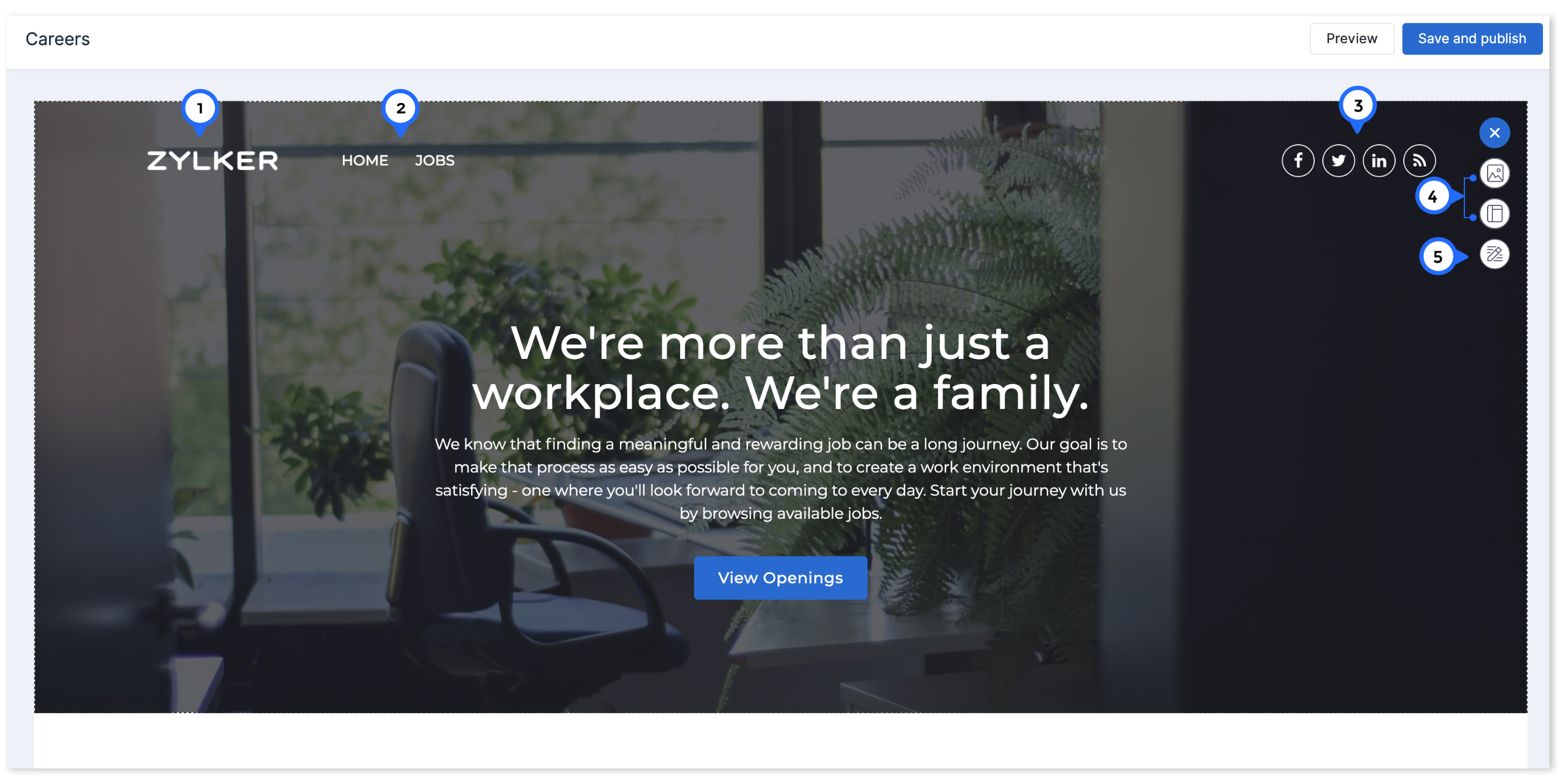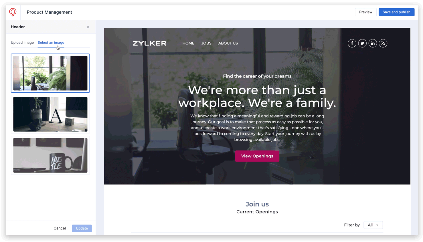 ヘッダーセクションでは、できることを活用して候補者に自社の紹介やカルチャー、価値観、福利厚生について伝えることができます。また、このセクションからソーシャルチャンネルへのリンクを追加したり、お好みのテーマを設定したりすることも可能です。