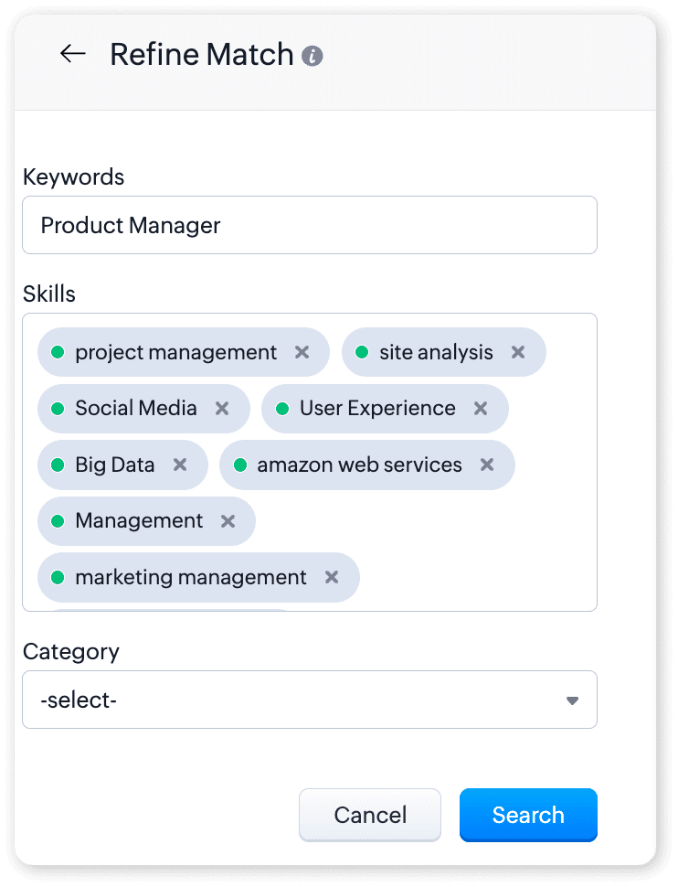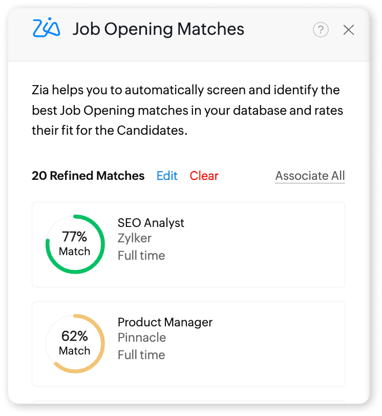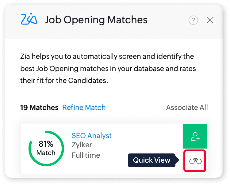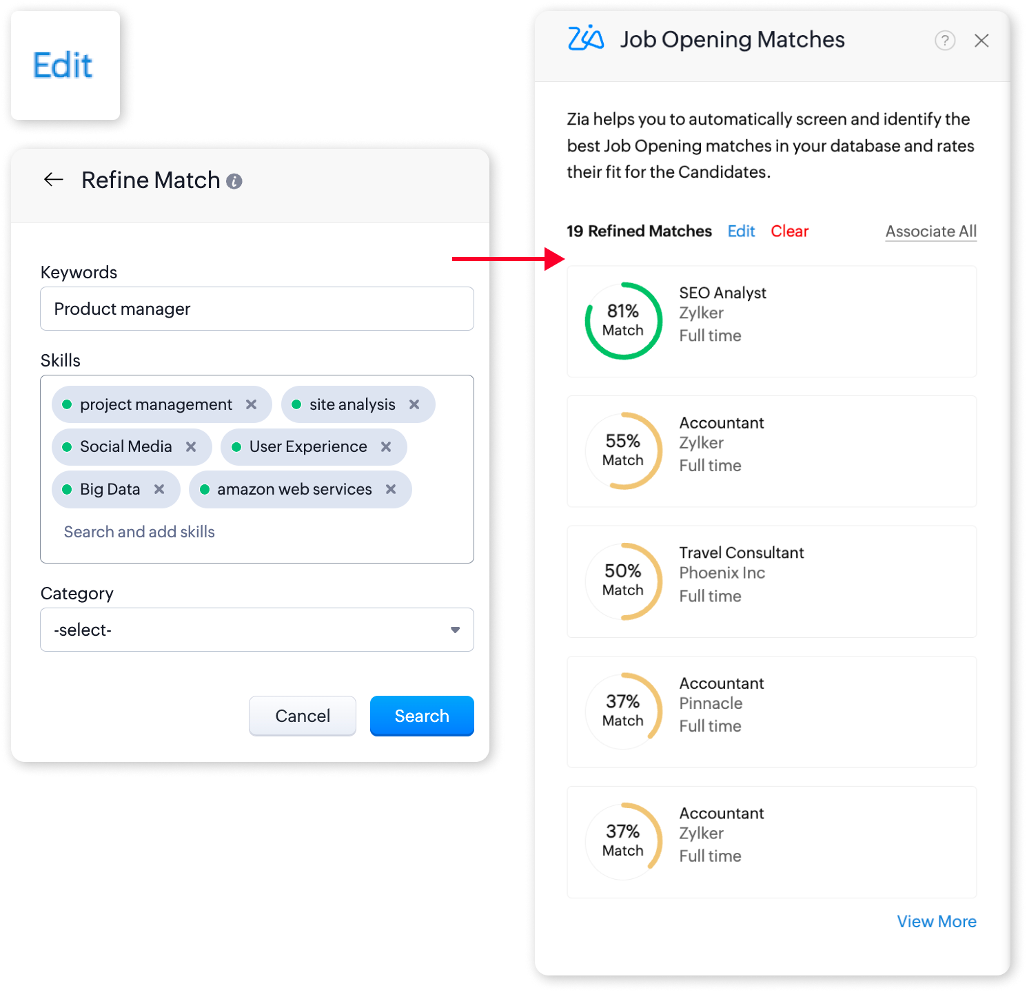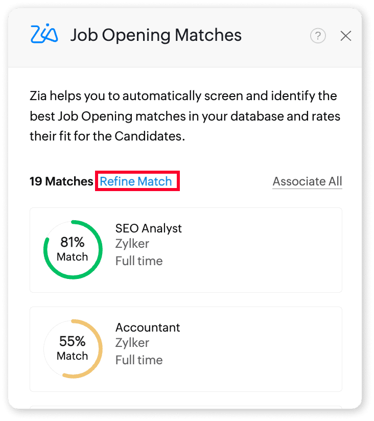 - 編集 Refined 照合する: このオプションを利用すると、キーワードやスキル、求人カテゴリーなど既存の絞り込み条件を変更できます。Ziaが修正した設定に基づきマッチング結果を更新します。