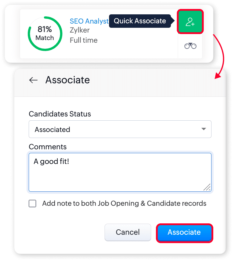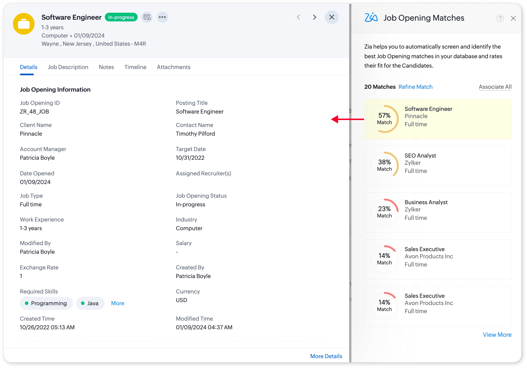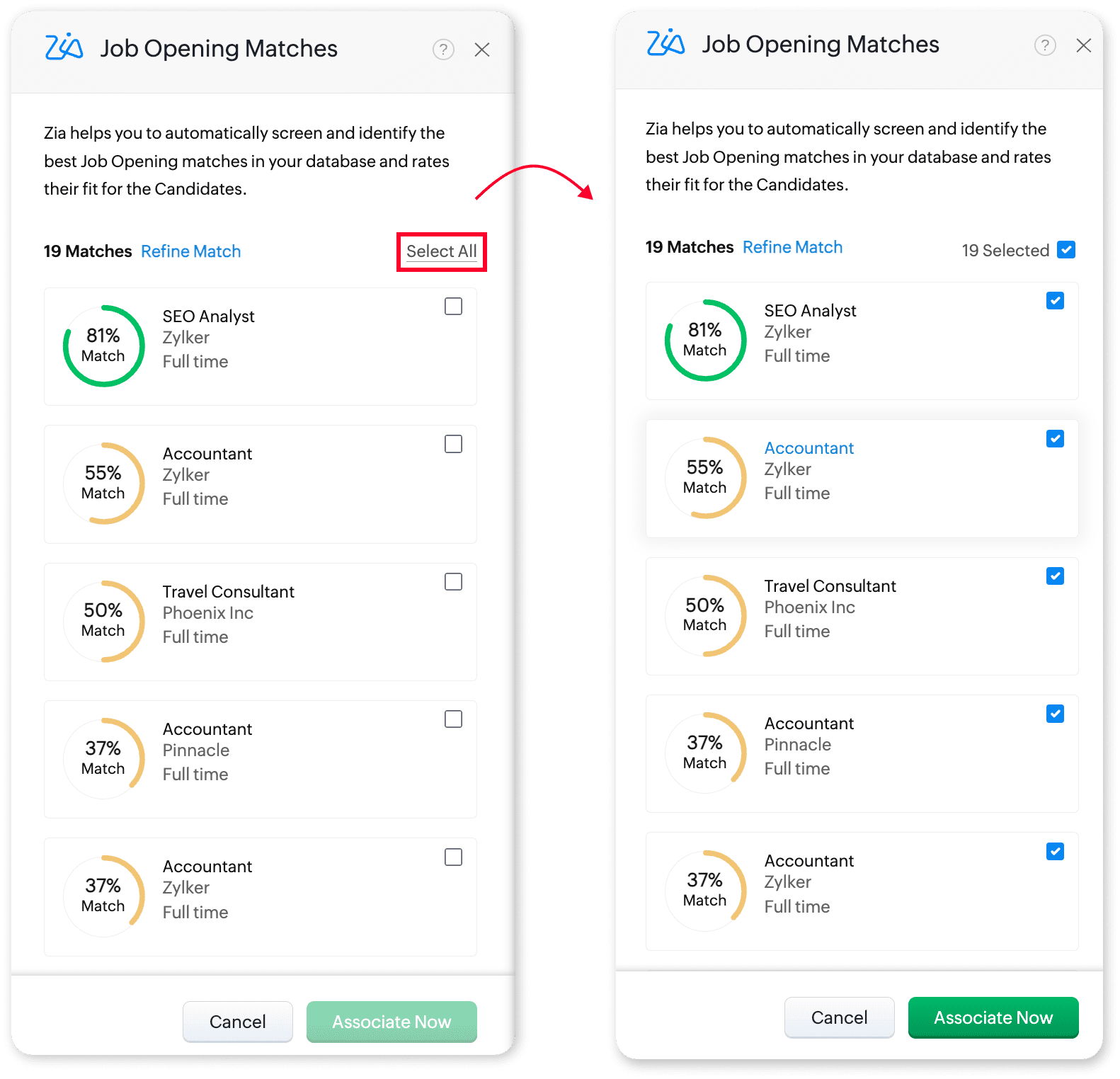 - 編集 Refined 照合する: このオプションを利用すると、キーワードやスキル、求人カテゴリーなど既存の絞り込み条件を変更できます。Ziaが修正した設定に基づきマッチング結果を更新します。