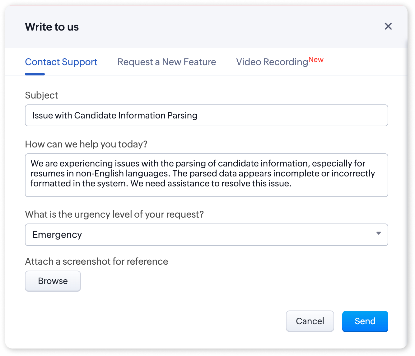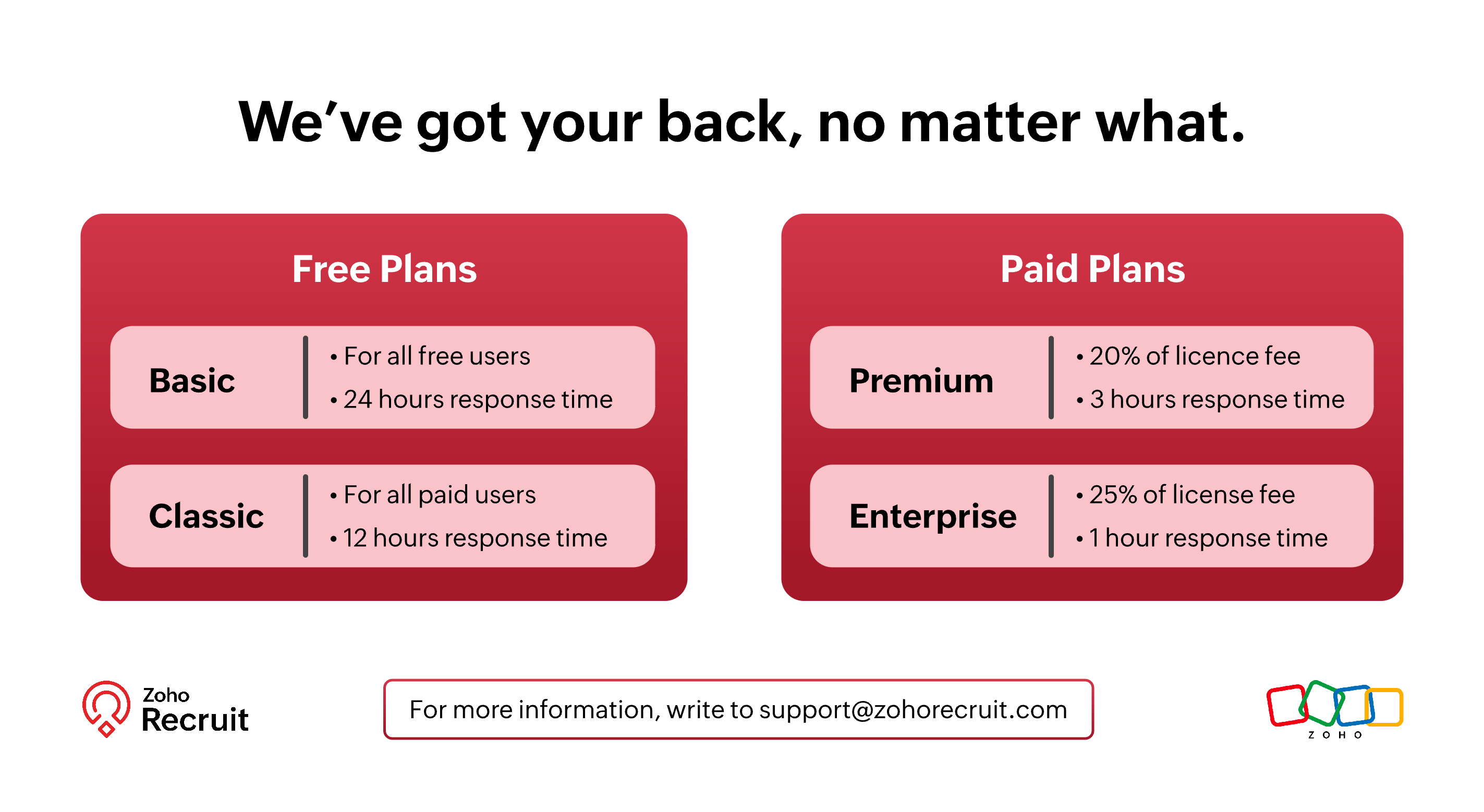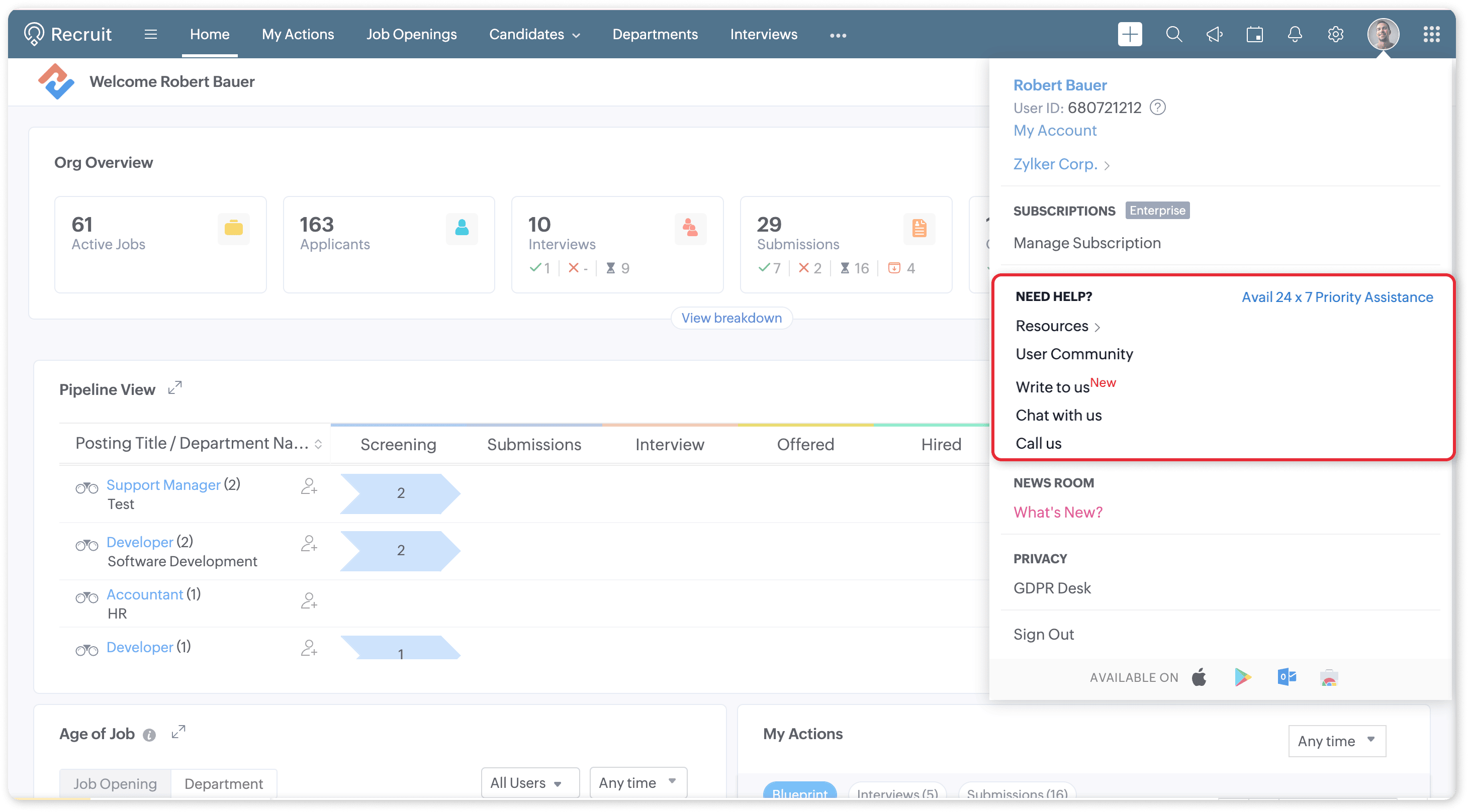 直接的なサポートに加え、ユーザーはZoho Recruit コミュニティにもアクセスでき、他のユーザーとの交流や知識の共有、よくある質問への回答を見つけることができます。Need ヘルプ? セクションや、Zohoのフォーラムから直接アクセス可能です。