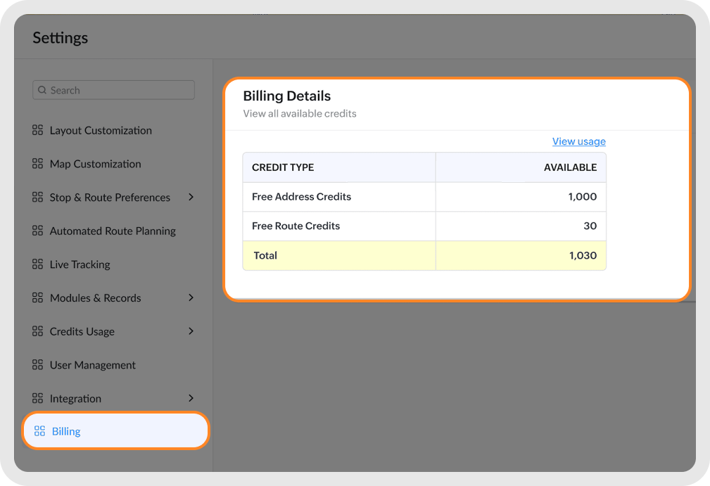 この[Billing]タブにアクセスするには、RouteIQ > Settings > Billing に移動します。