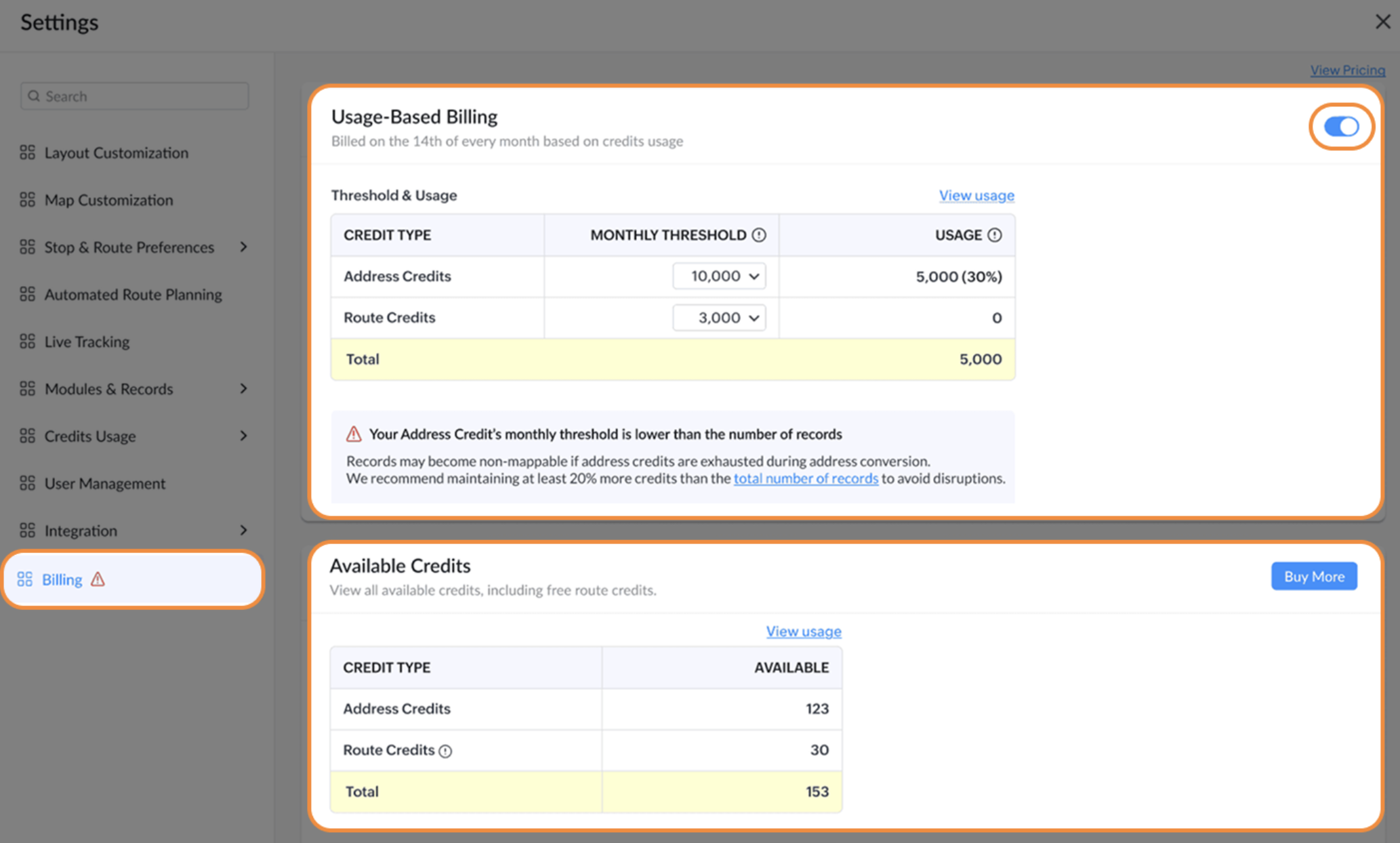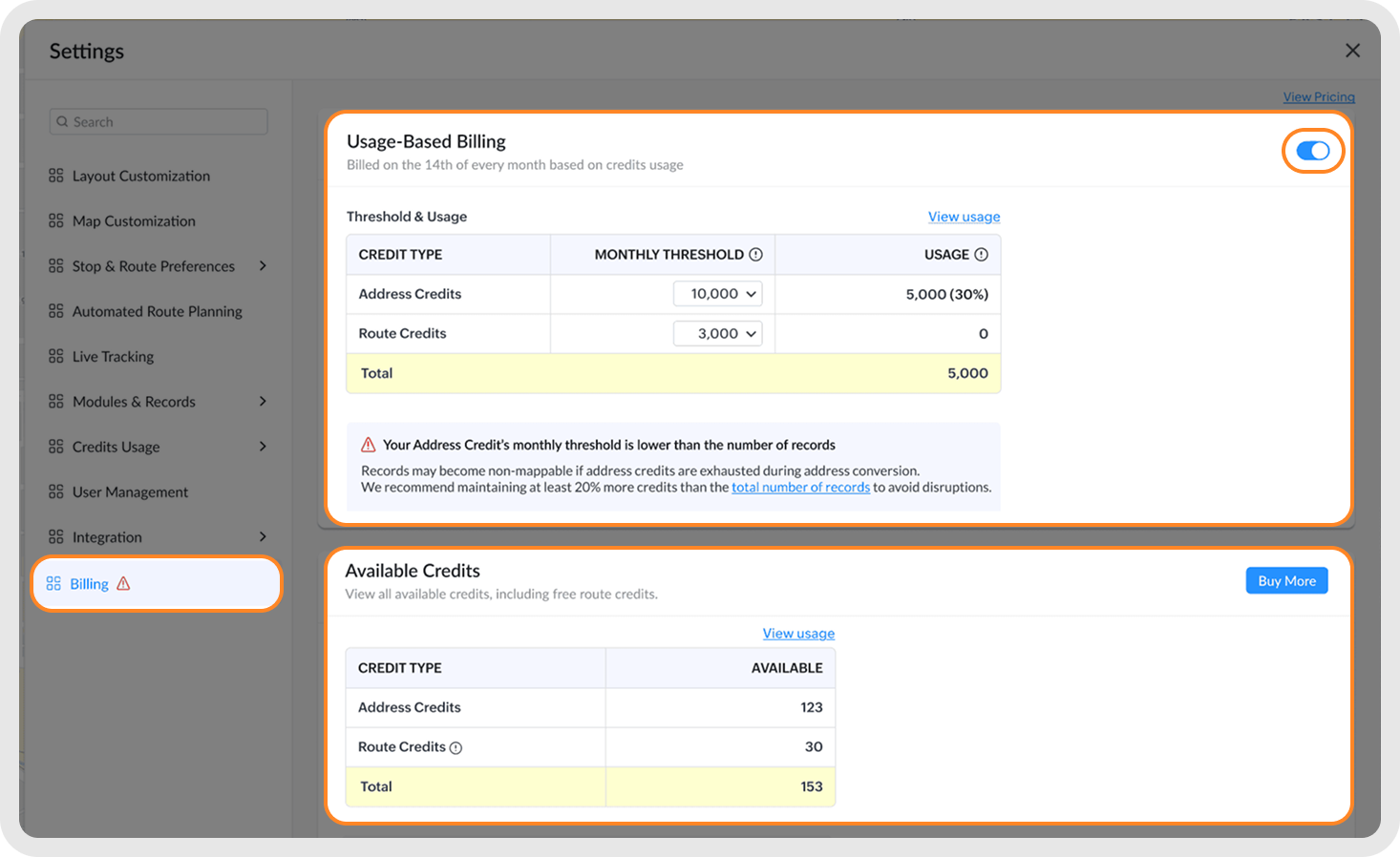 月次の Address Credit(AC)のしきい値が、有効なタブ全体のレコード総数より低く設定されている場合、[請求]セクションの横に警告アイコンが表示され、[請求]ページ内にバナー通知が表示されます。また、「レコード総数」はクリック可能なリンクとなり、RouteIQ 設定 → タブ & レコード → 有効なタブ にリダイレクトされます。AC のしきい値が低すぎると、住所変換や住所の更新が中断される可能性があります。