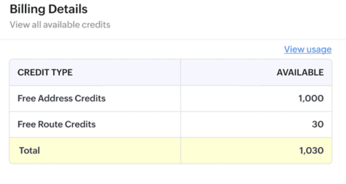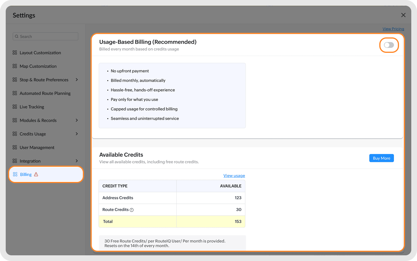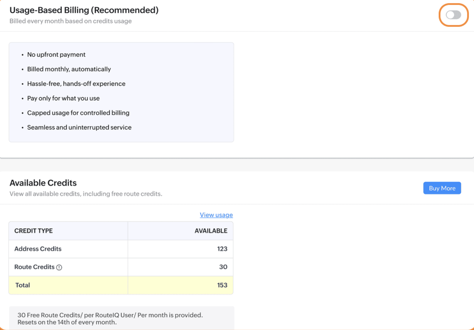 1. ホスト製品(Zoho CRM など)が有料プランで、RouteIQ クレジットを前払いで購入している場合、[Billing]ページにはセットアップ画面が表示されます。ここで管理者は、利用可能な住所クレジット(AC)とルートクレジット(RC)を確認し、従量課金を有効化(最適な動作のため、この方式を推奨します)し、「Buy More」を使用して追加クレジットを購入できます。