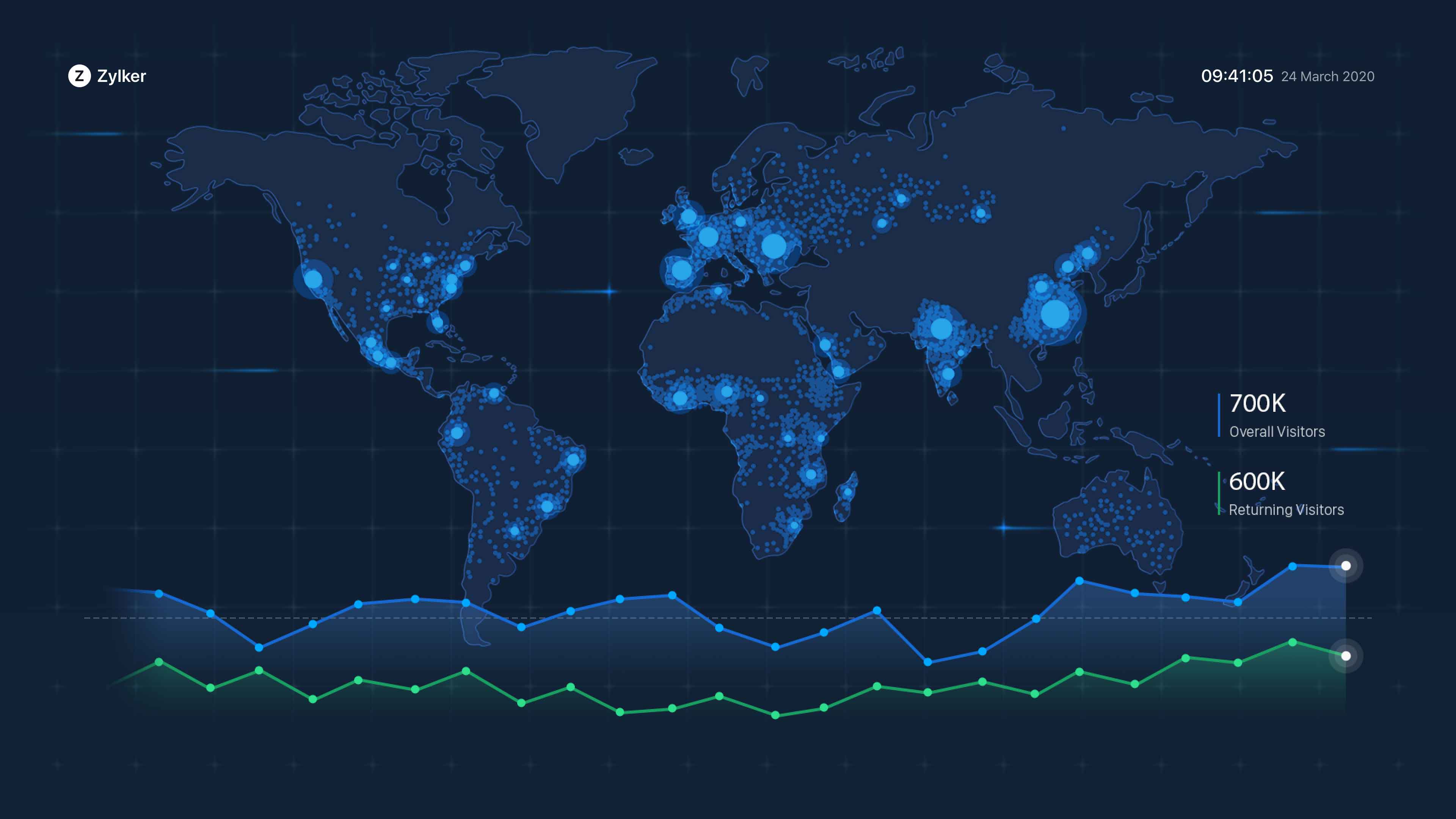 各訪問者の情報を地図上で確認できます。Webサイトにアクセスした訪問者の出入りをリアルタイムで確認できます。地図の下部にあるグラフでは、訪問者数の合計と再訪問者数を確認できます。