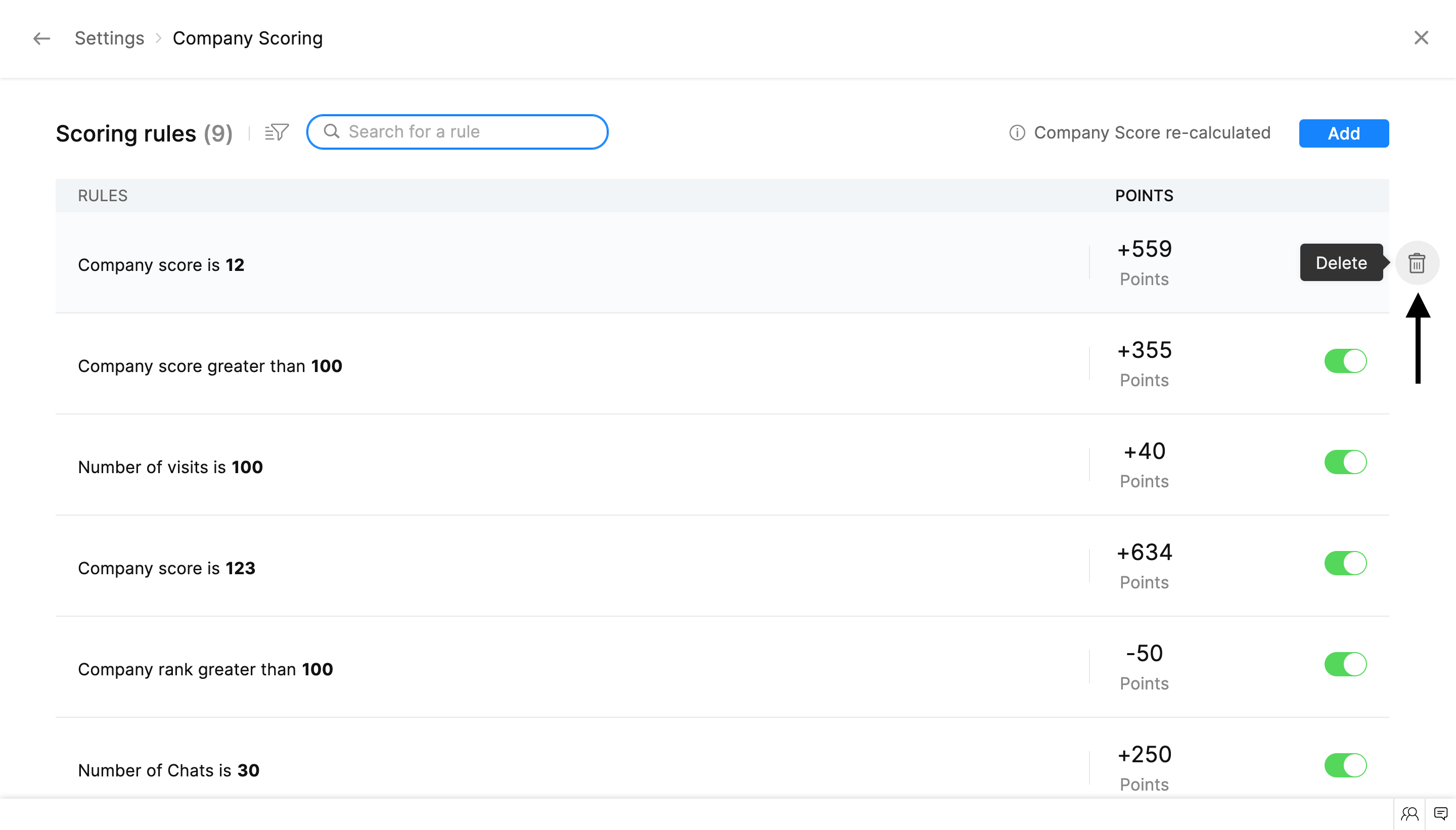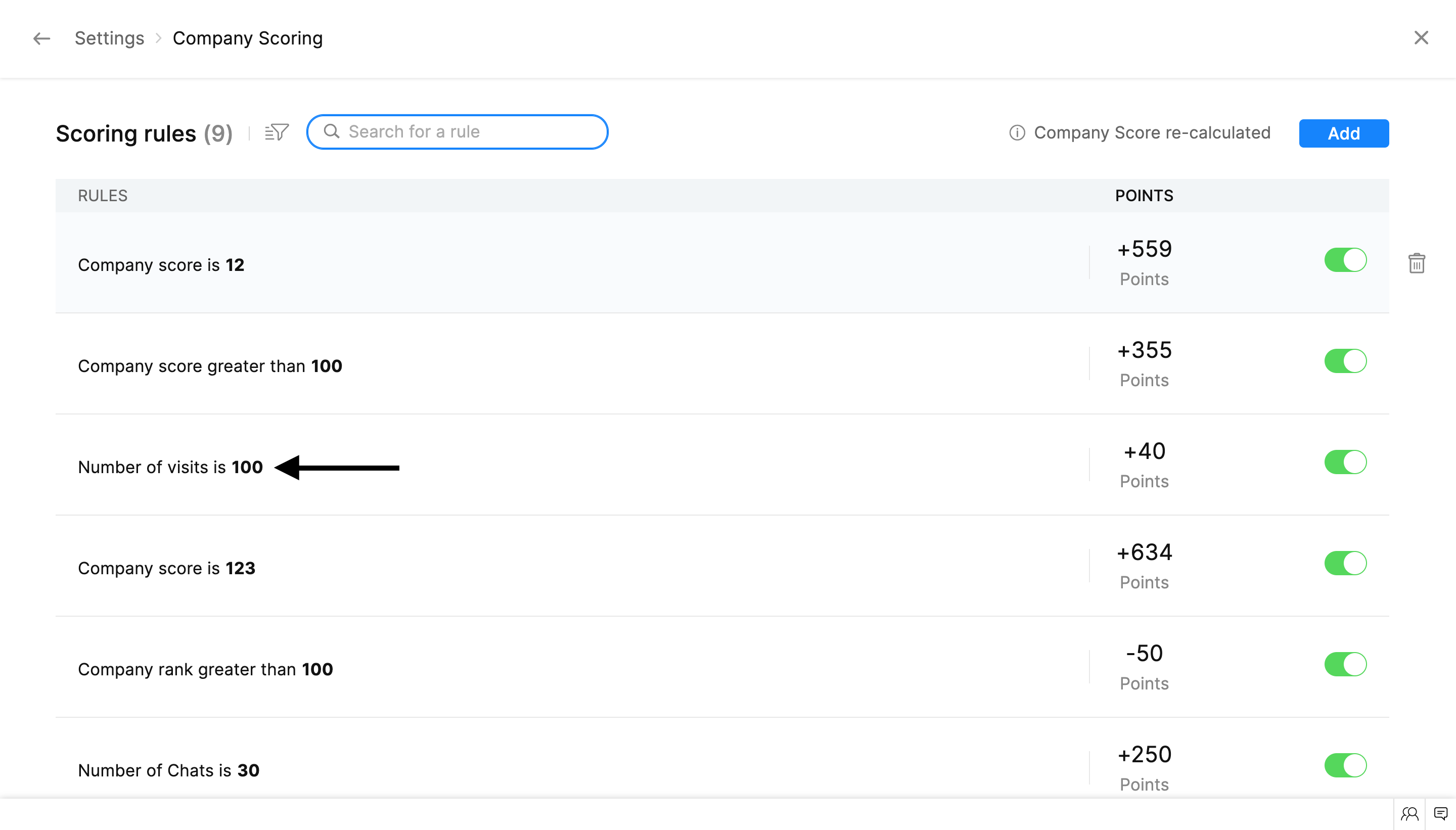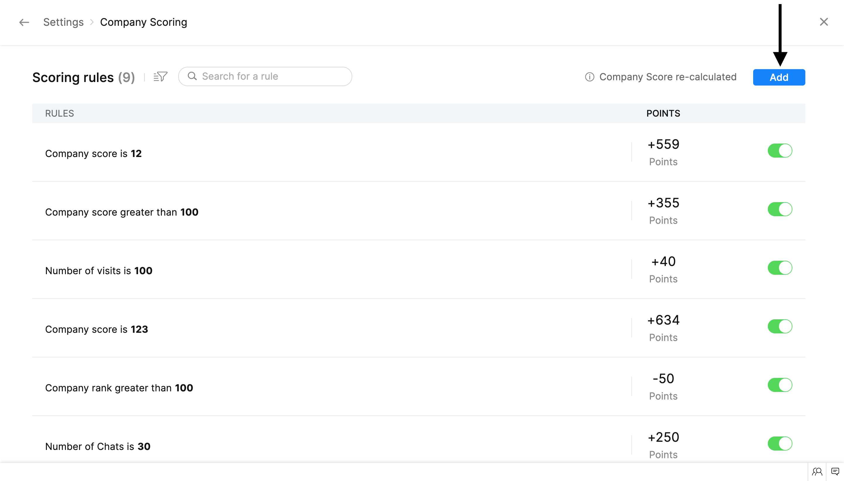 [設定]→[自動化]→[会社スコアリング]に移動し、ルールを設定して、指定した条件に対してスコア(ポイント、得点)を割り当てることができます。新しいルールを追加するか、既存のルールをクリックして編集できます。