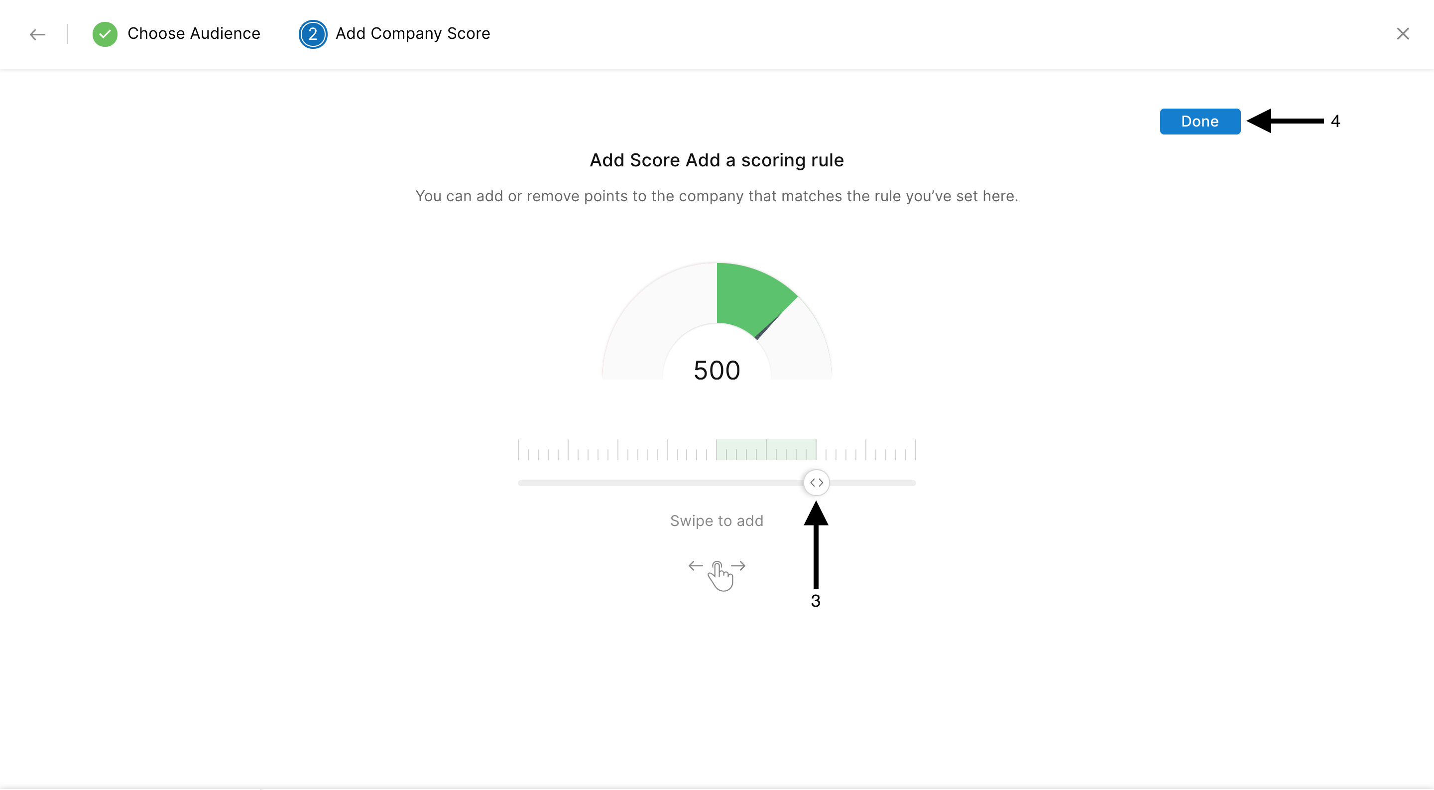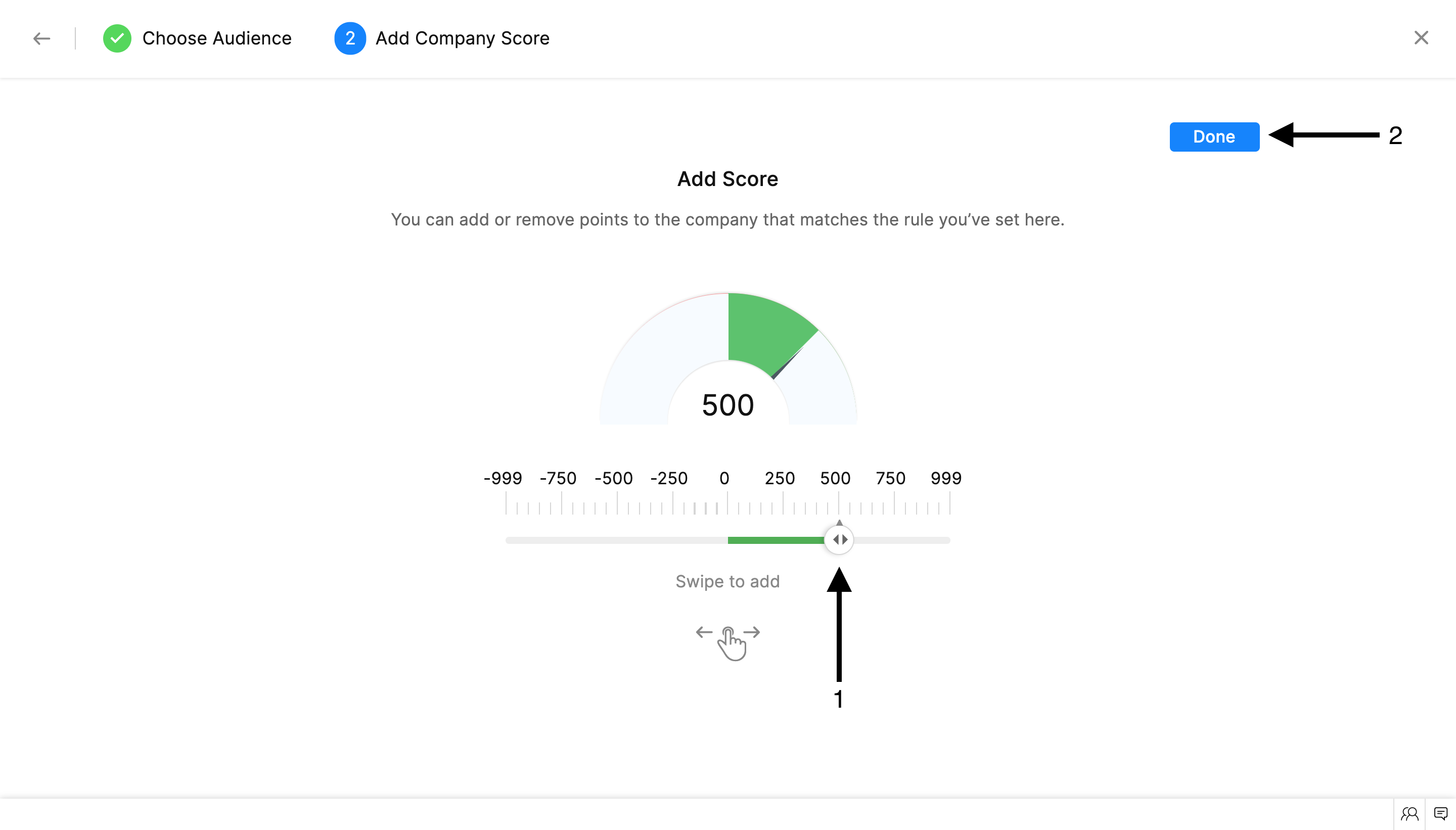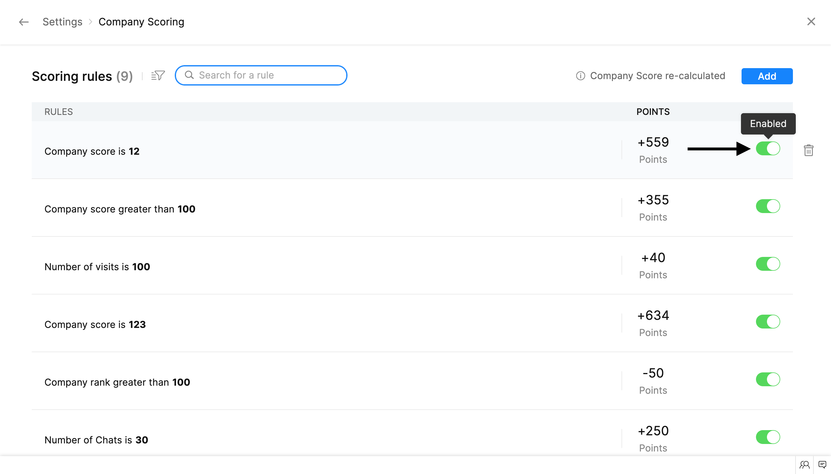 [設定]→[自動化]→[会社スコアリング]に移動し、ルールを設定して、指定した条件に対してスコア(ポイント、得点)を割り当てることができます。新しいルールを追加するか、既存のルールをクリックして編集できます。