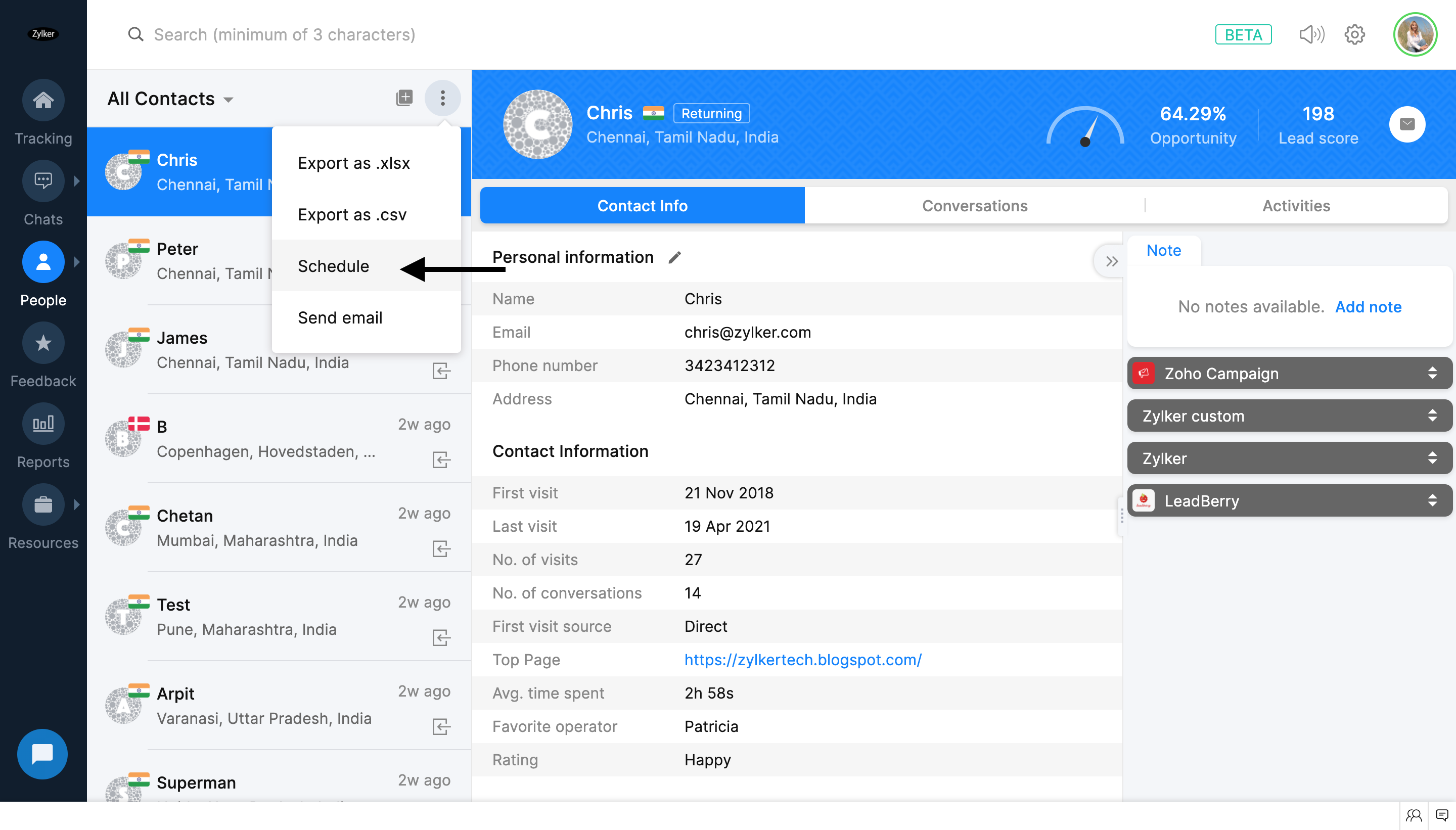 1. Zoho SalesIQの追跡画面で、[連絡先]→[連絡先]の順に移動します。リストの種類の右端にある3点ドット(その他の操作)アイコンをクリックします。次に、[予約する]をクリックします。