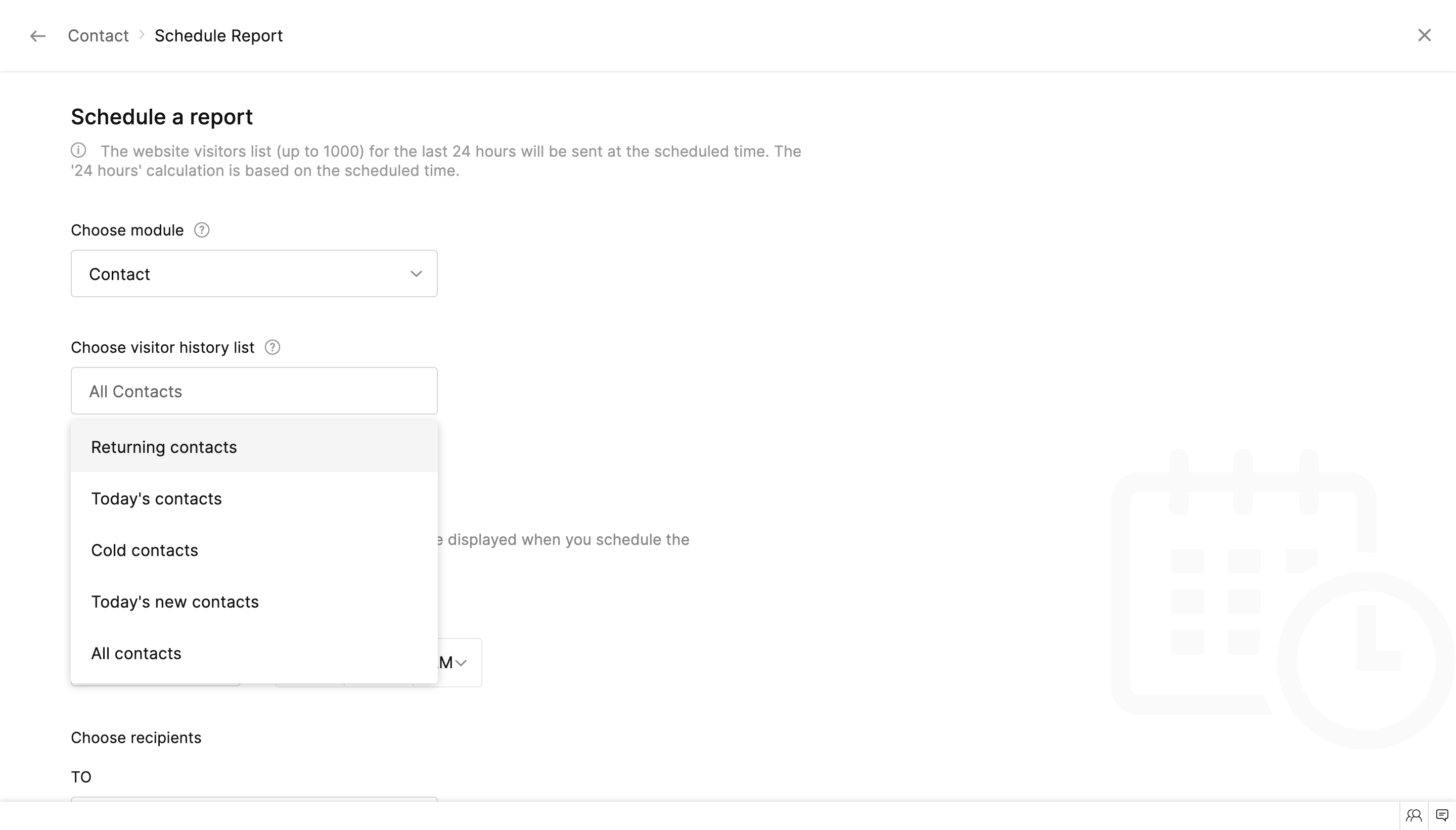 3. 対象とする訪問者履歴リストを、次から選択します:すべての連絡先、再訪問した連絡先、今日の連絡先、見込みの低い連絡先、今日の新しい連絡先