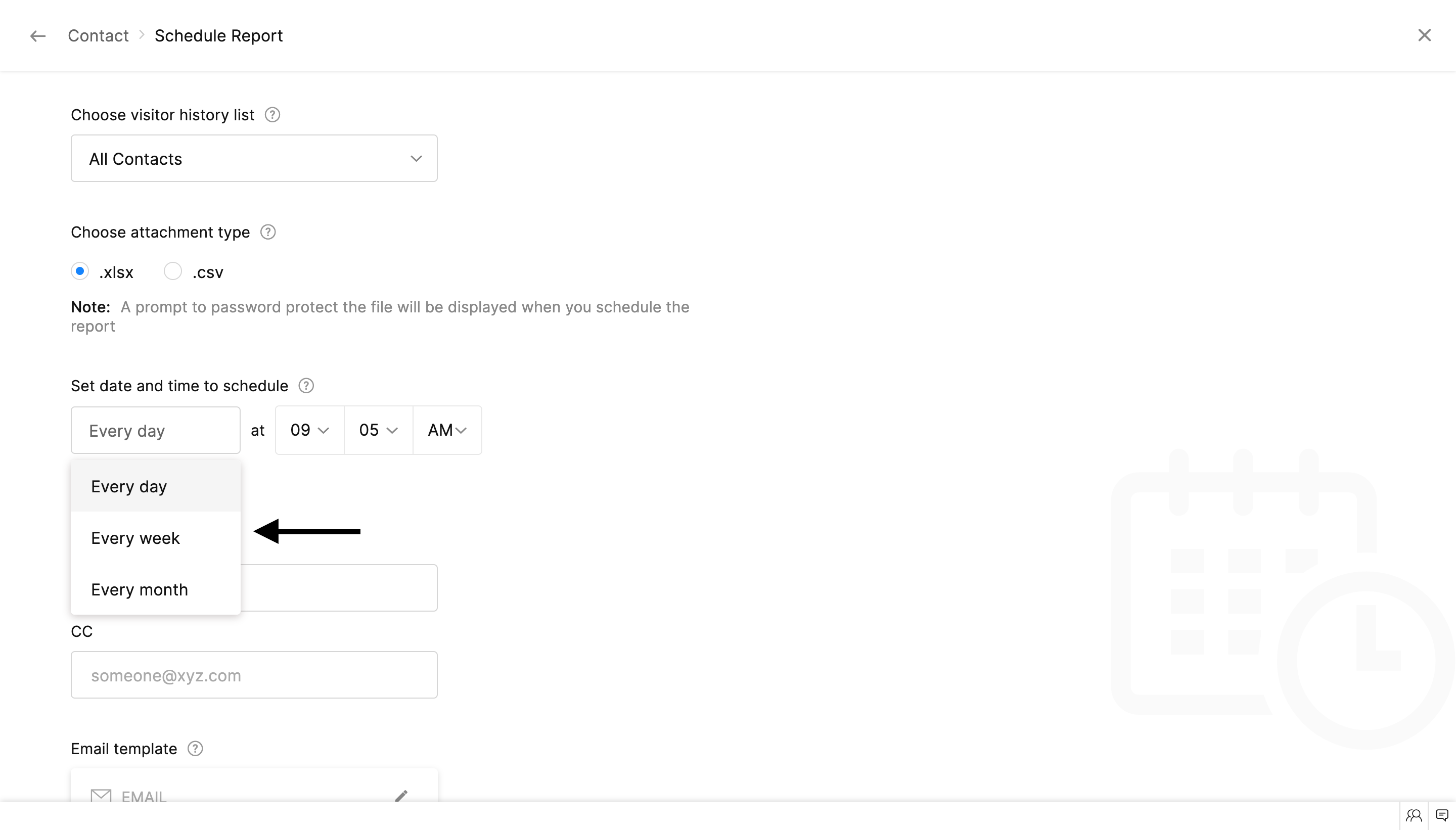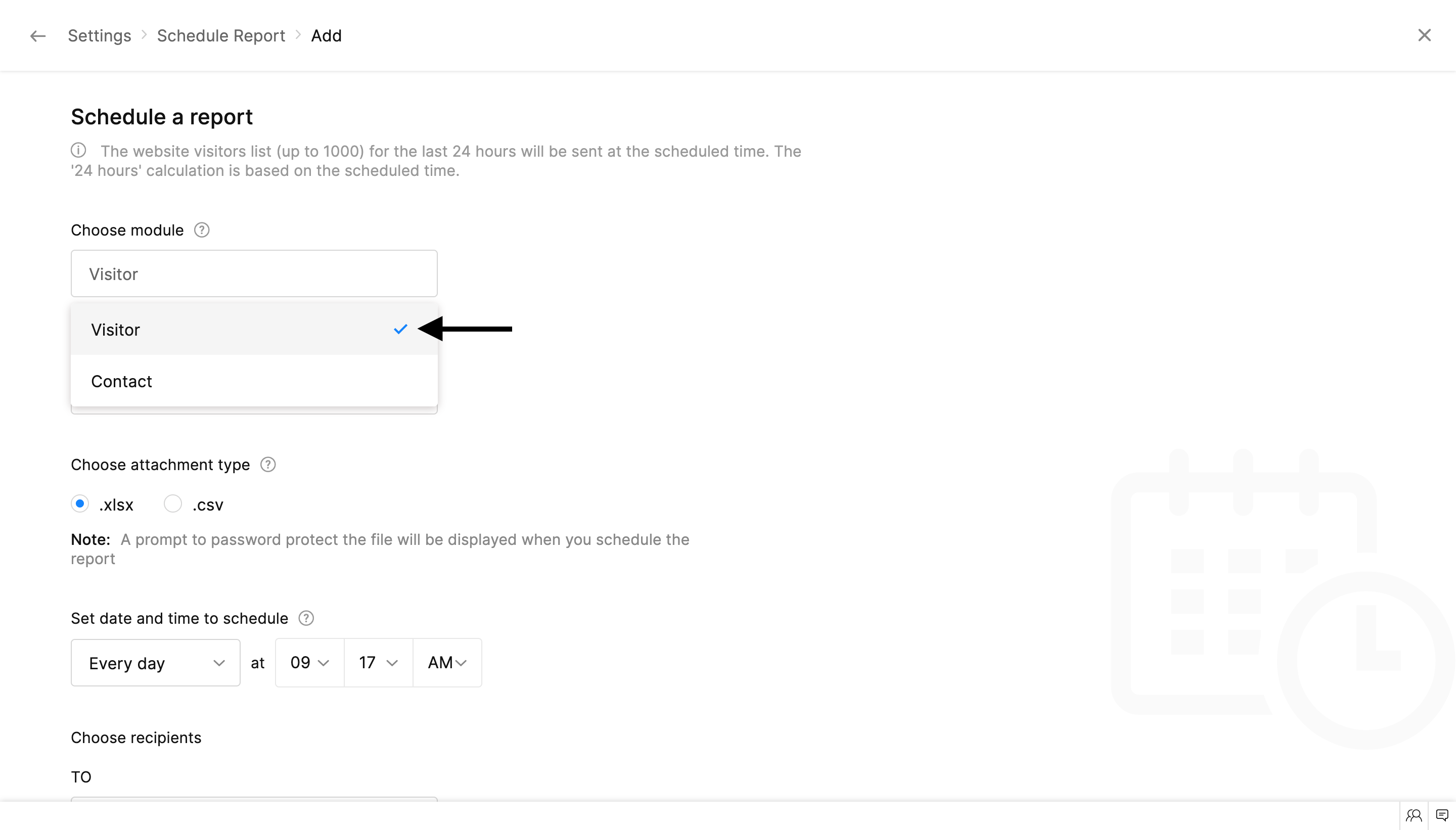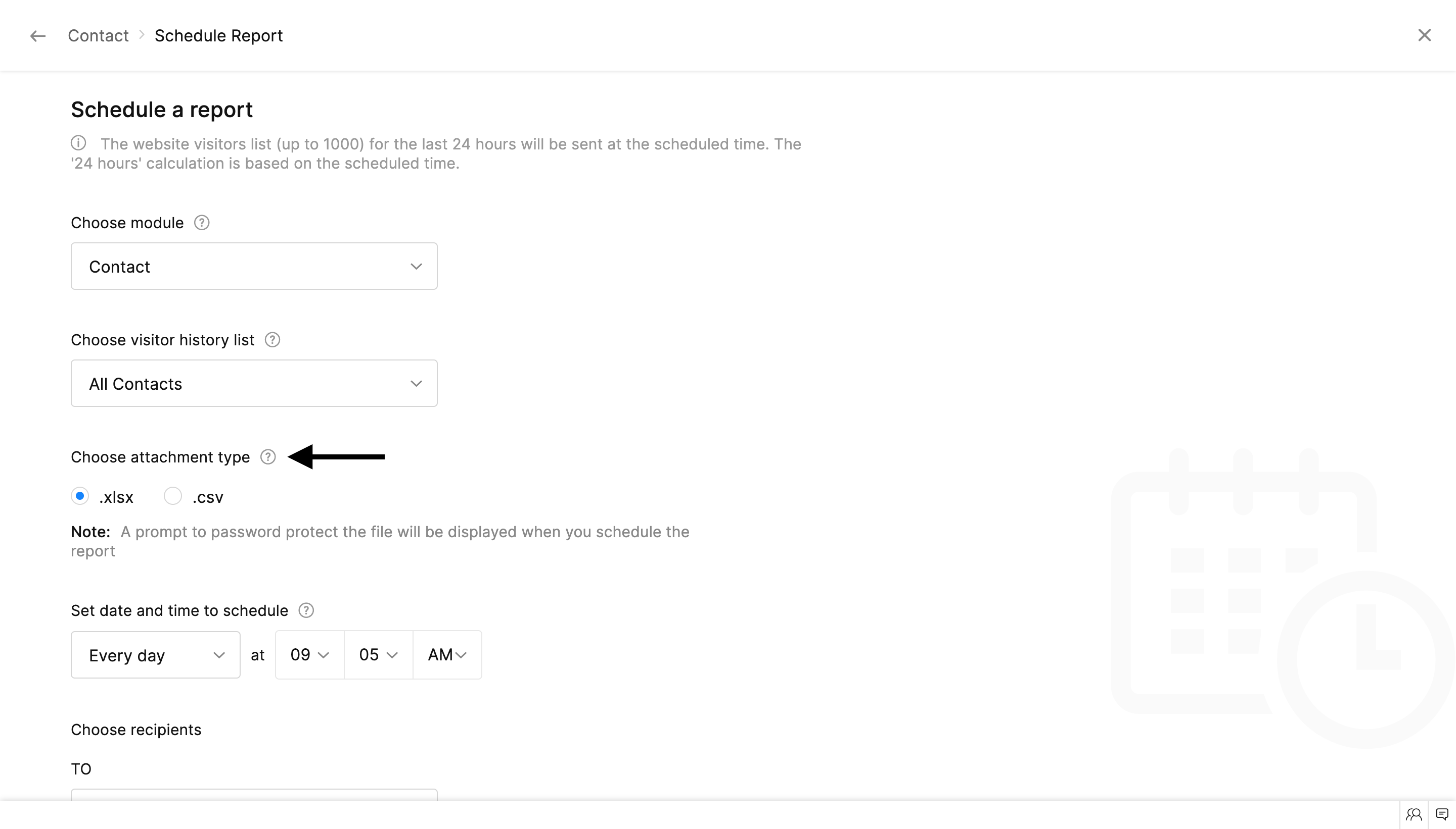 4. 添付ファイルの種類を、次から選択します:.xlsx、.csv。 メールの添付ファイルには、最大1,000人分の訪問者情報が含まれます。