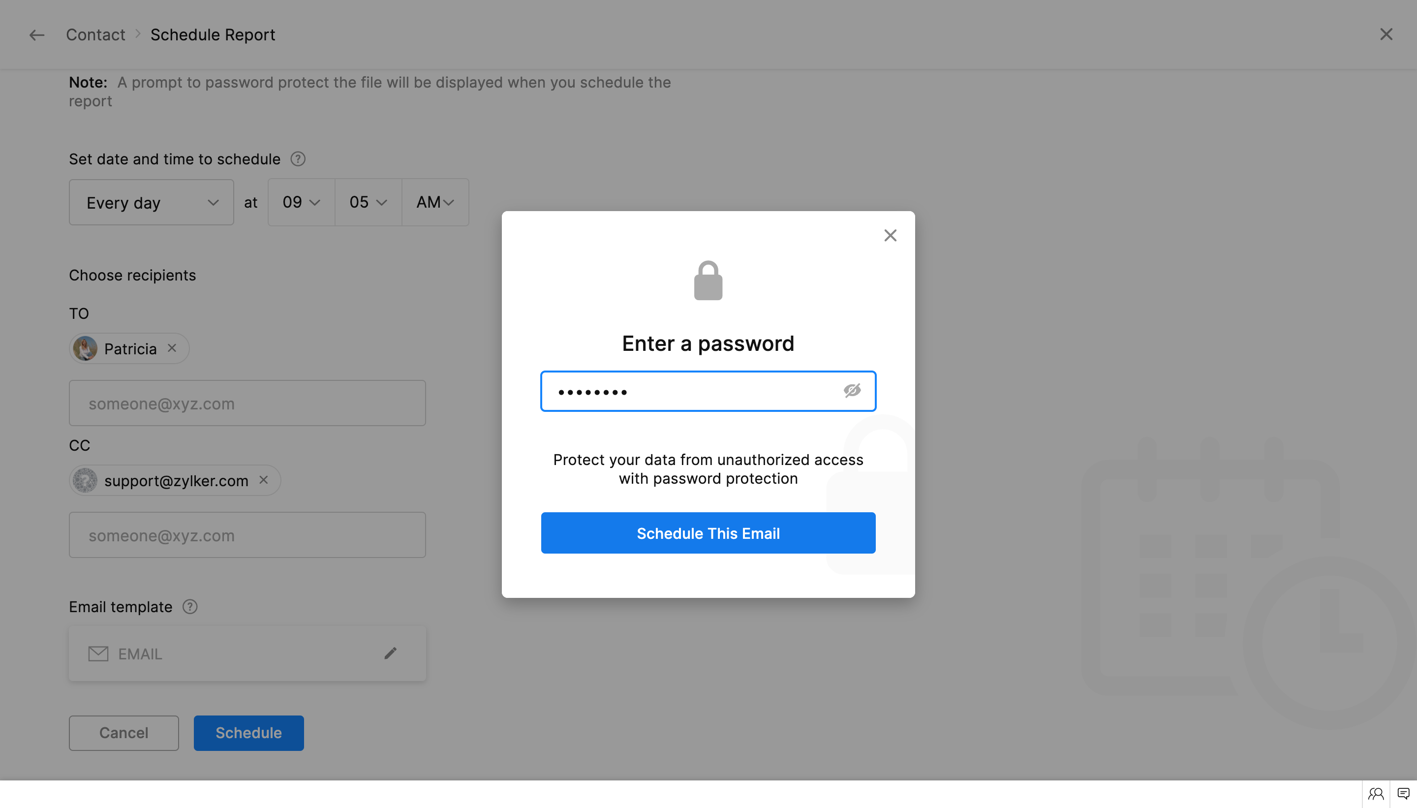 10. パスワードの入力後に、[このメールを予約する]をクリックします。これにより、指定した日時での定期レポートの設定が完了します。