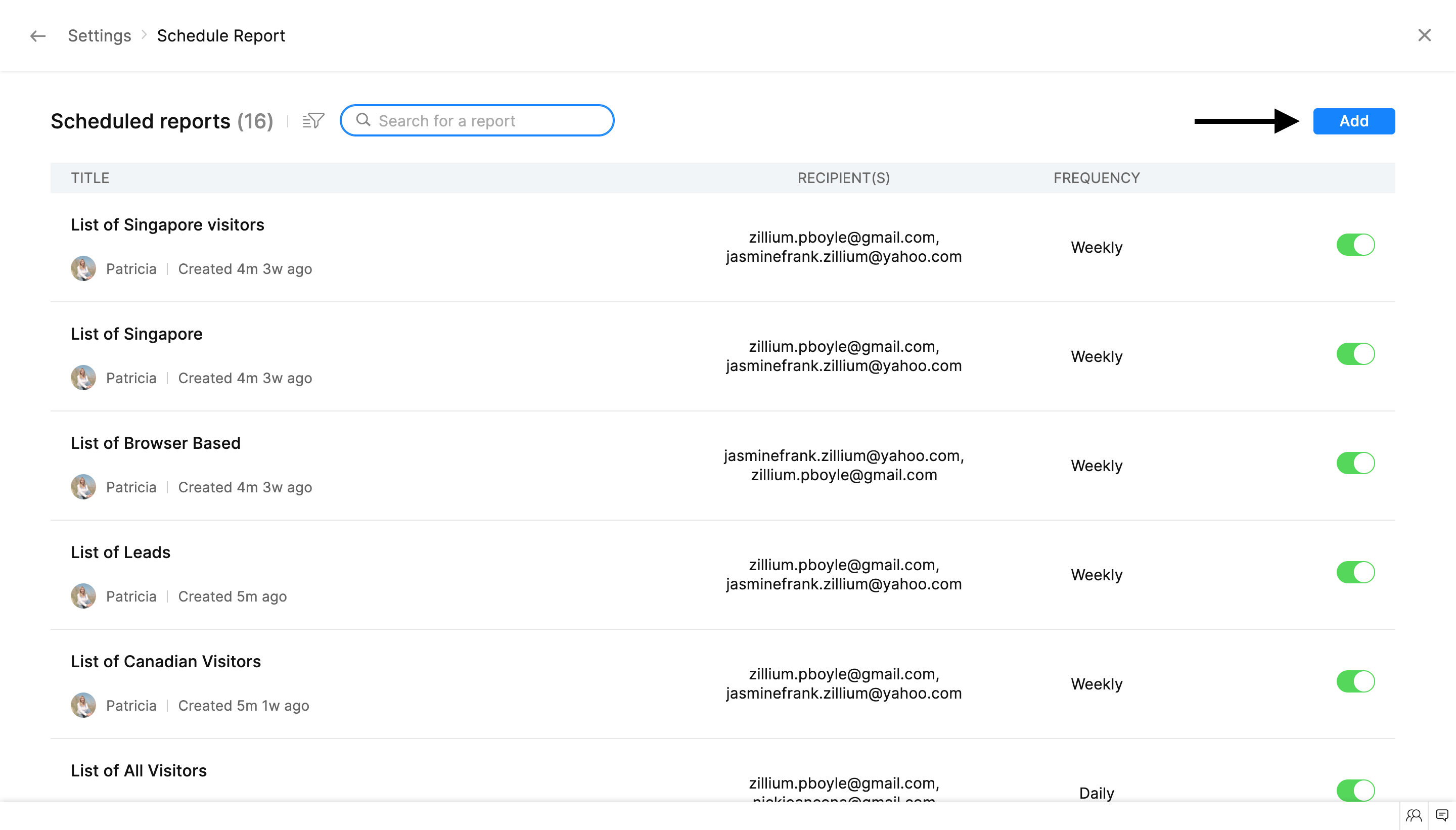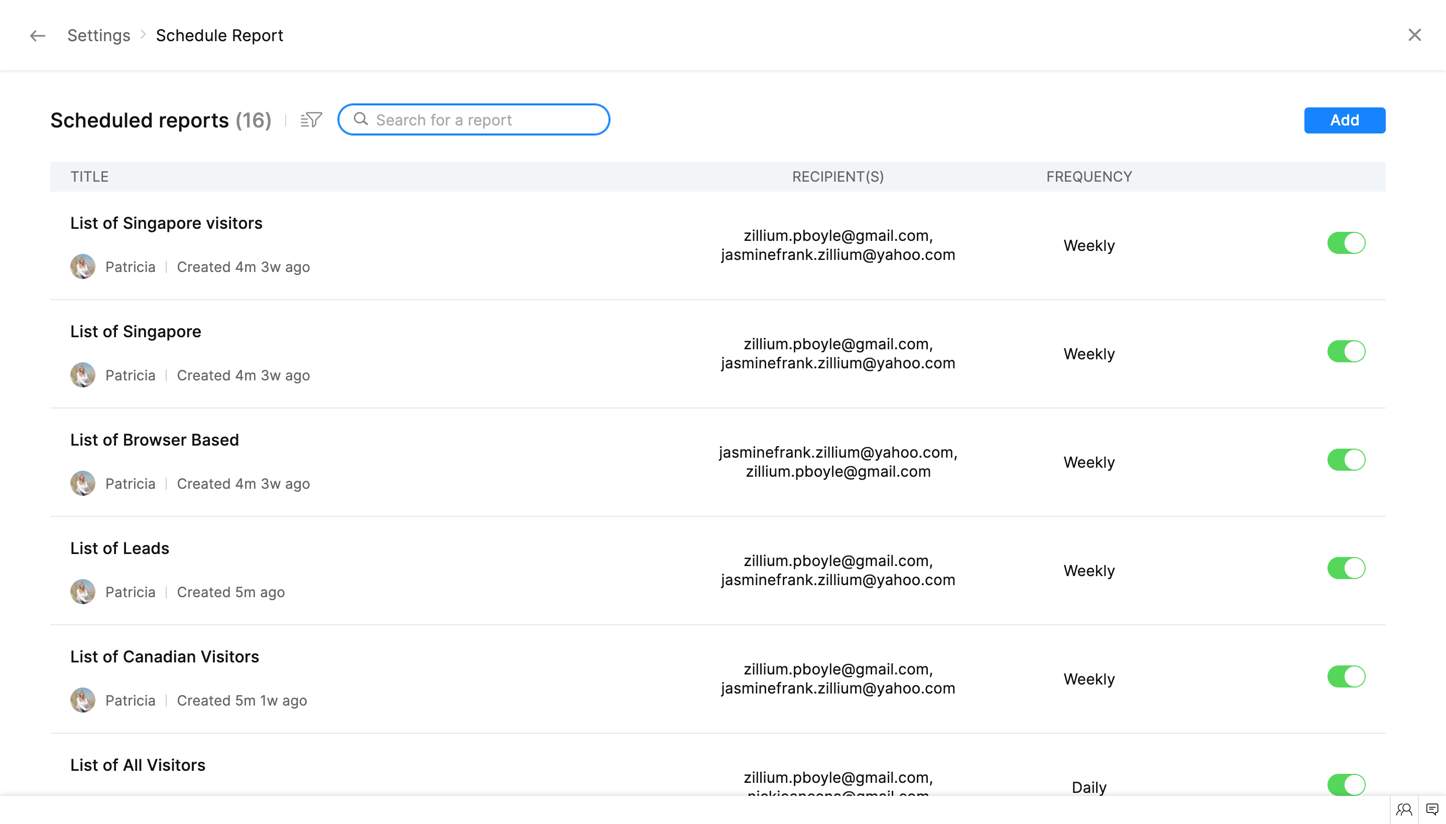 2. こちらで、頻度と受信者のメールアドレスを確認し、編集できます。各定期レポートの有効化/無効化、削除もできます。