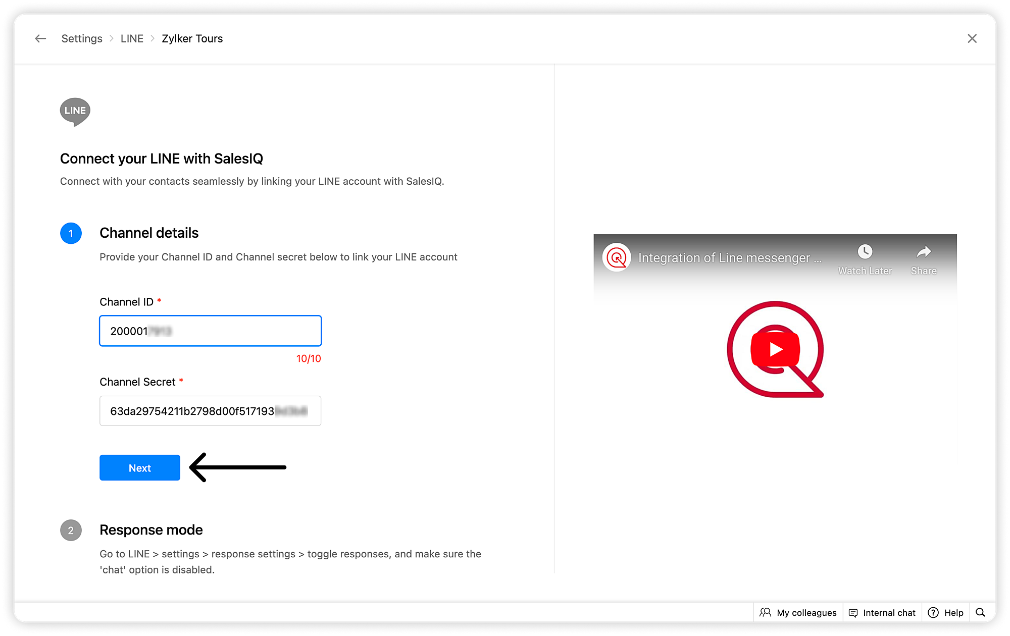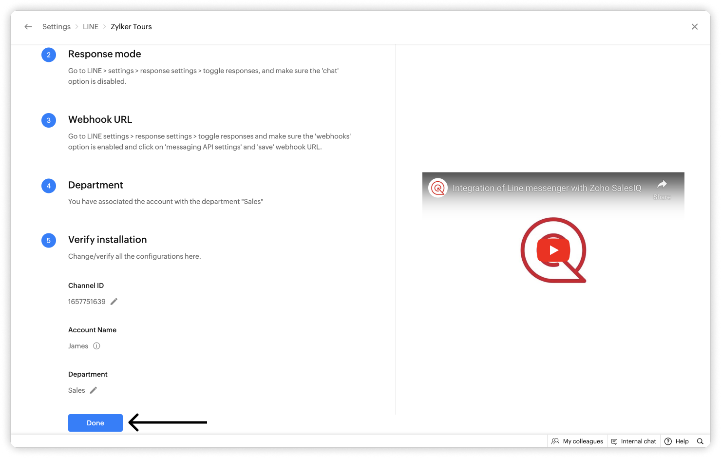 以上で完了です!折れ線グラフチャットとZoho SalesIQの連携が正常に完了しました。これで折れ線グラフチャットを使って顧客とコミュニケーションを取り、サポートを提供できます。