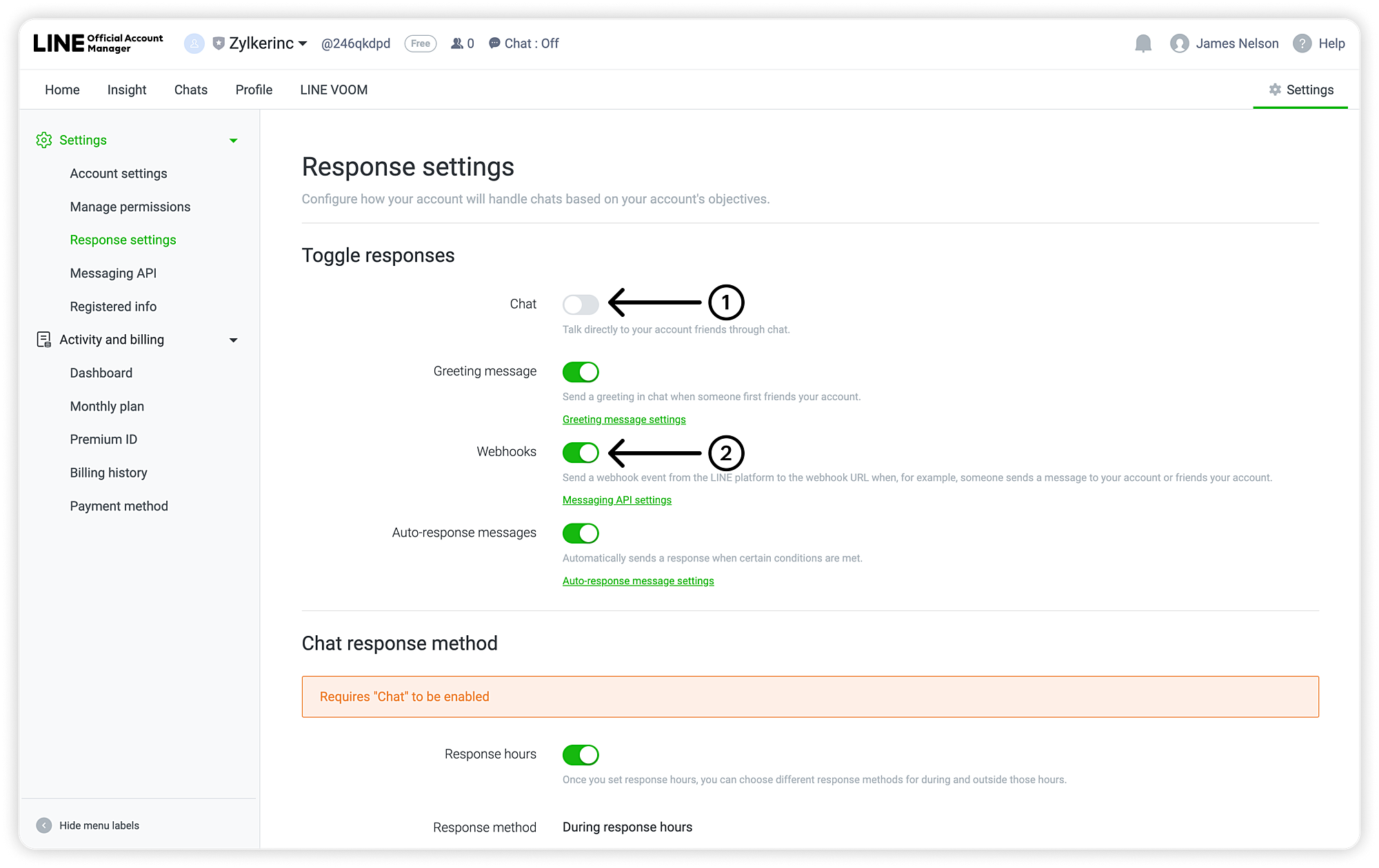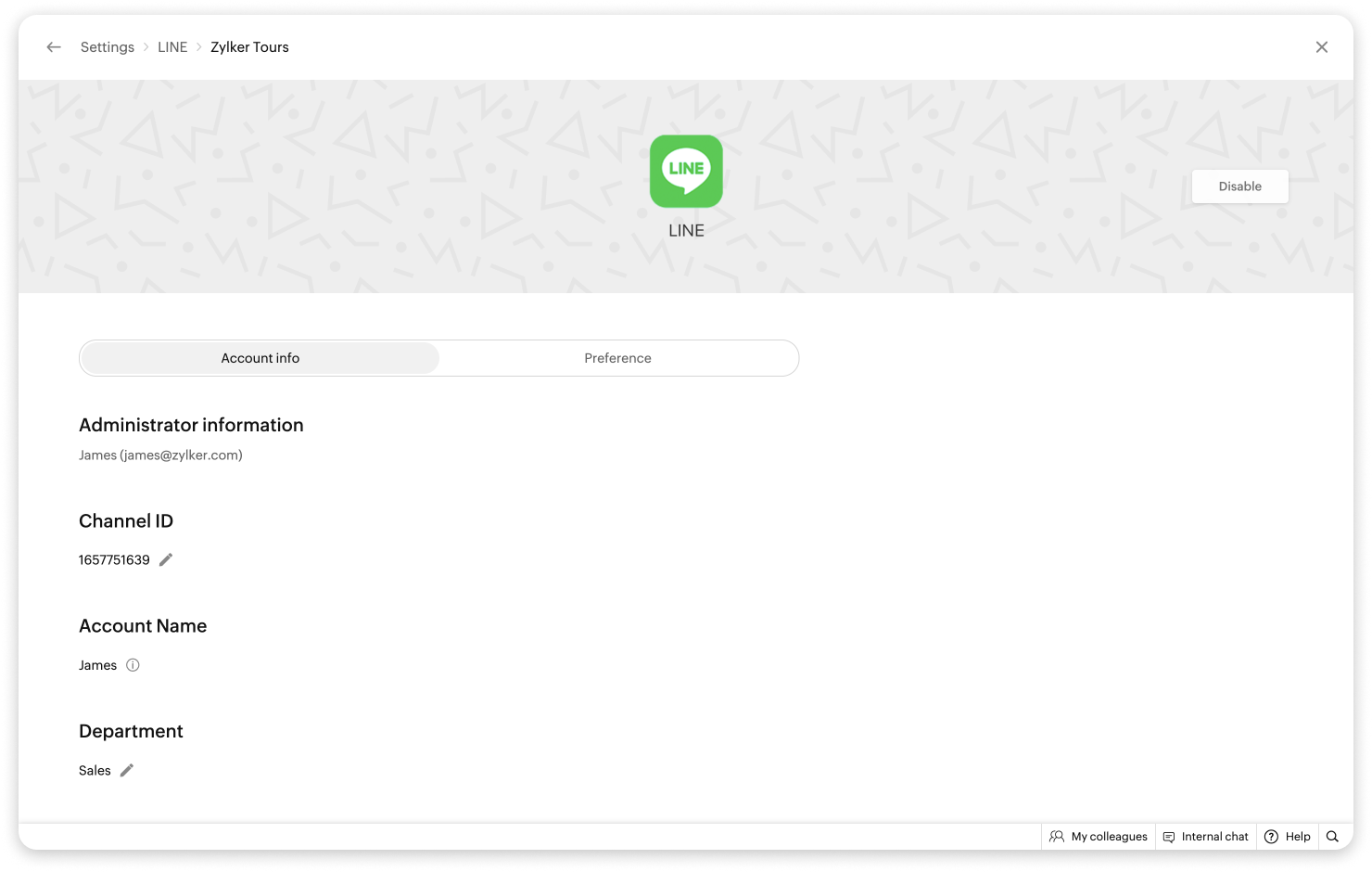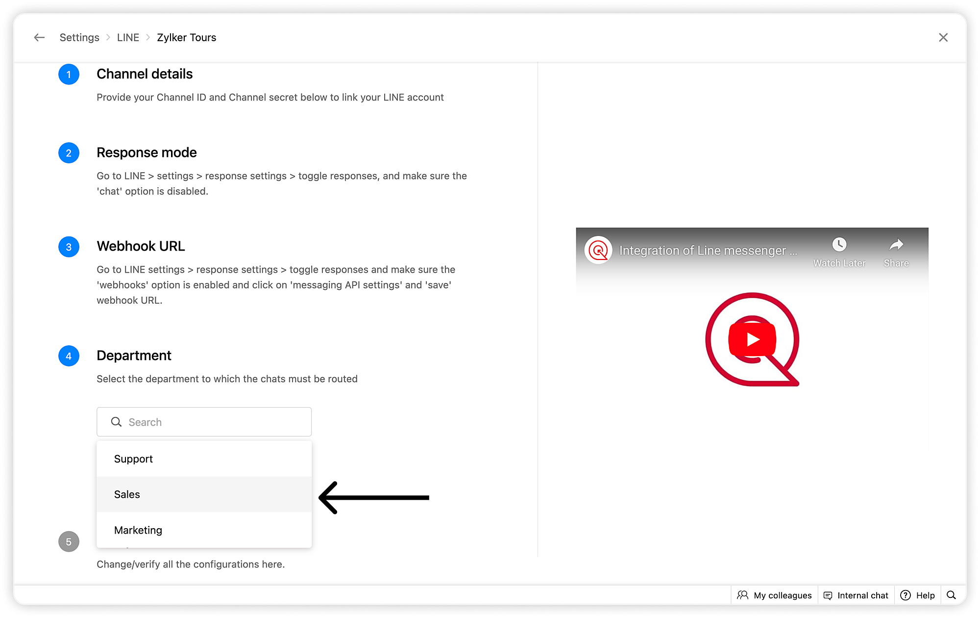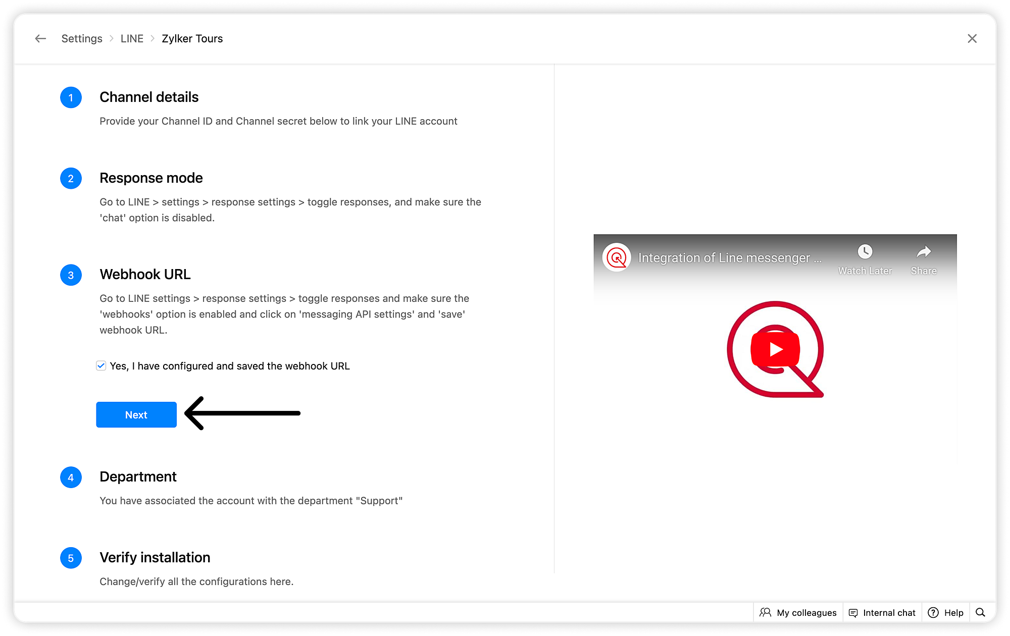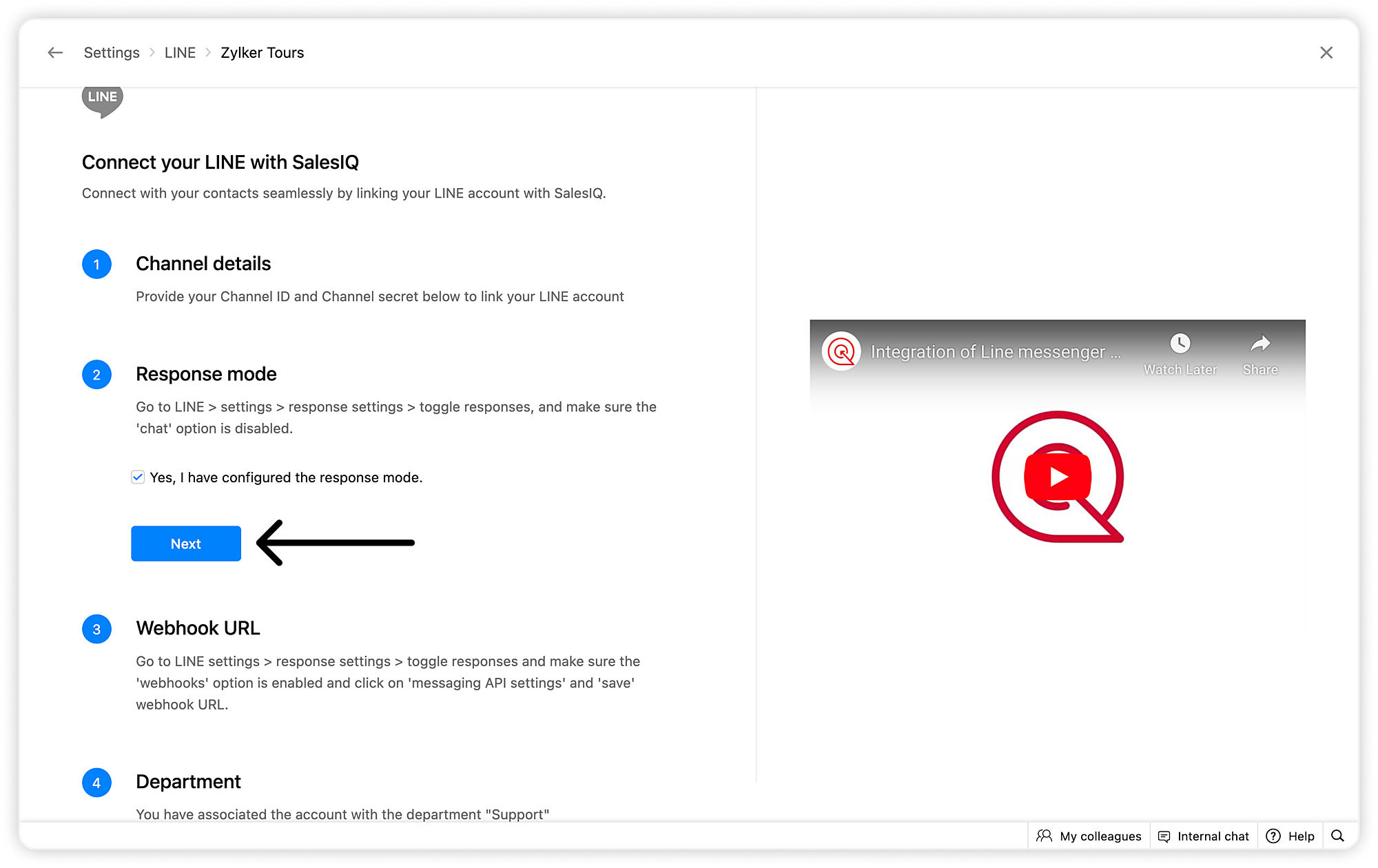 Chatオプションをオフにし、Webhookを有効にした後、折れ線グラフ chat 設定からZoho SalesIQの折れ線グラフ chat 設定ページに戻ります。