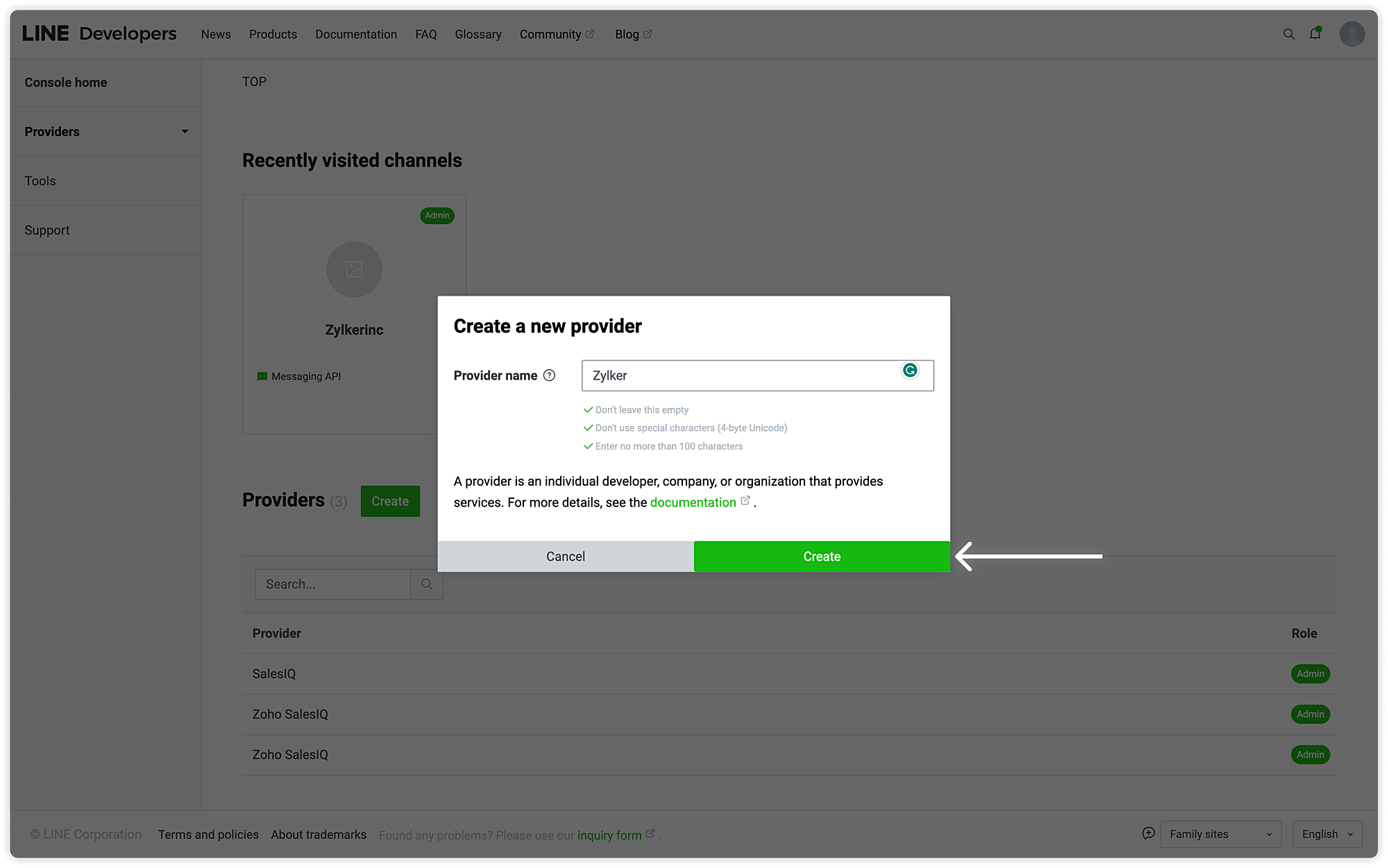 折れ線グラフ ChatをZoho SalesIQと連携するには、以下の手順に従ってください。