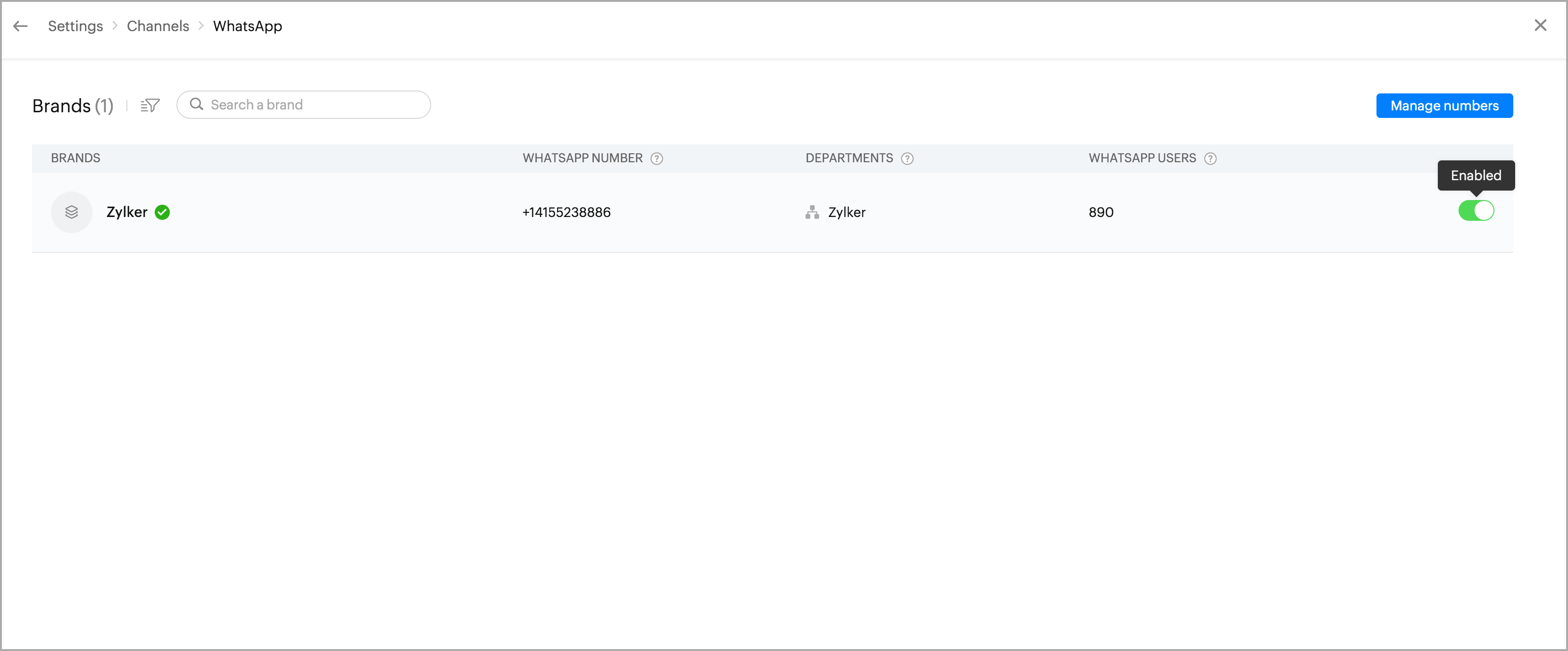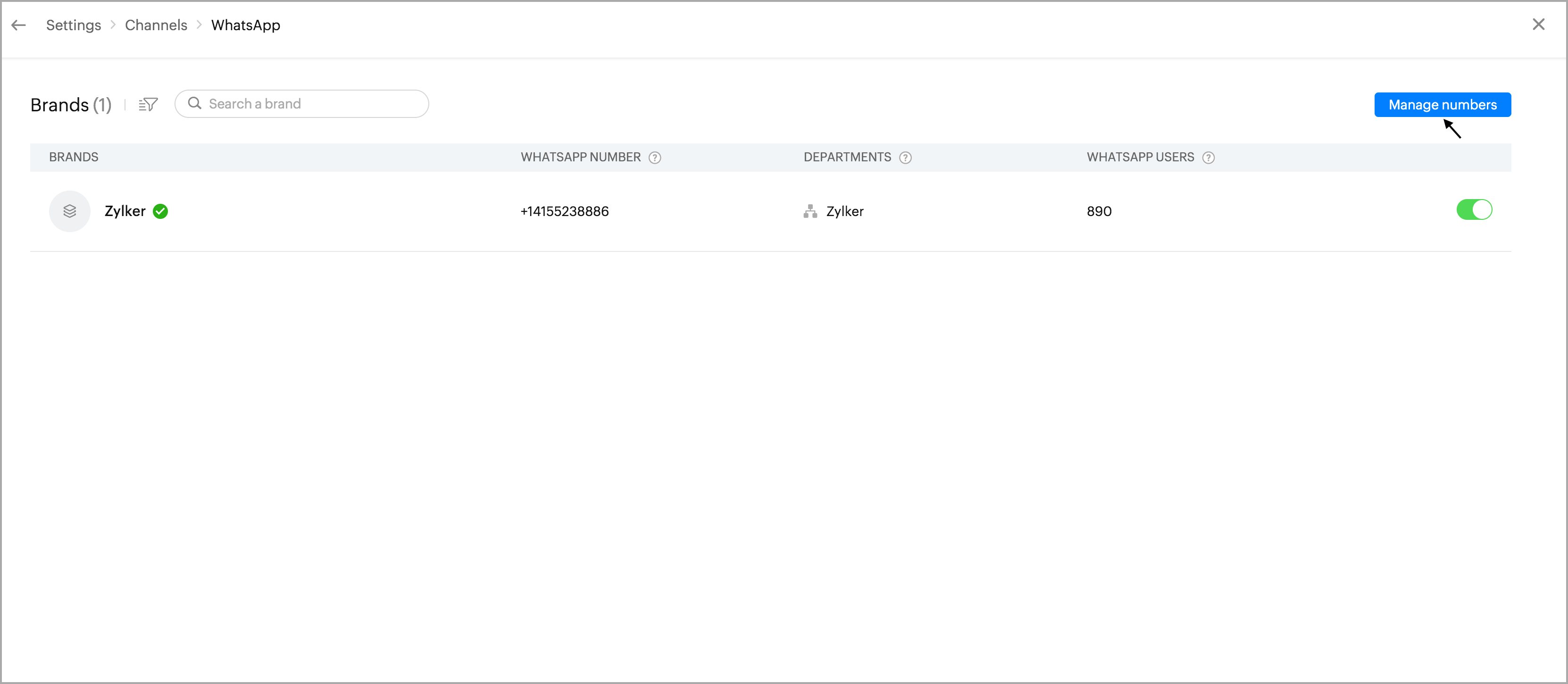 13. WhatsAppの電話番号に関連付けられているブランドは、[設定]→[経路]→[WhatsApp]のページに一覧表示されます。各ブランドの切り替えスイッチをクリックすると、WhatsAppの電話番号に関連付けられているブランドを有効または無効にできます。