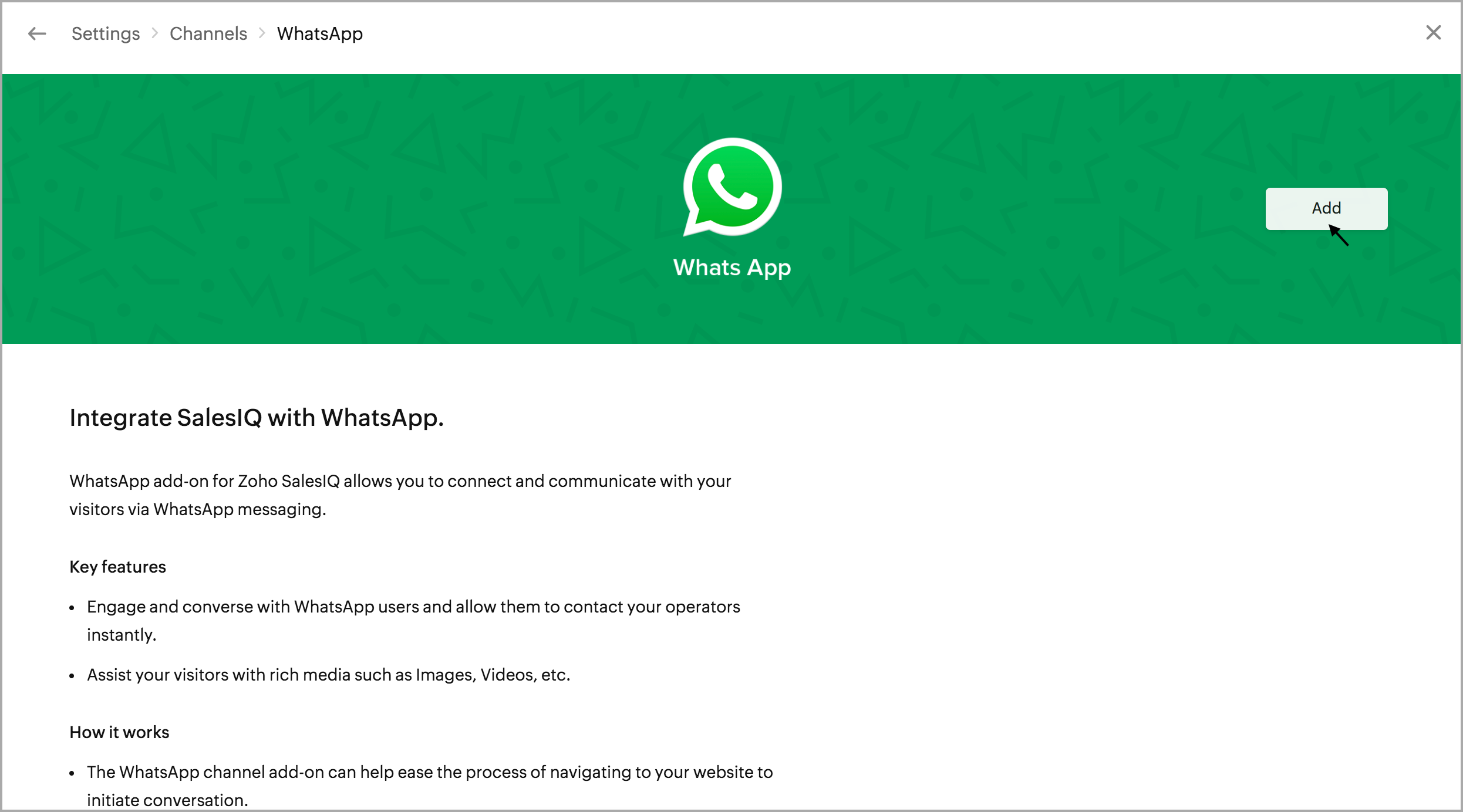 - [設定]→[開発者向け情報]→[経路]に移動し、[WhatsApp]を選択し、[追加する]をクリックします。