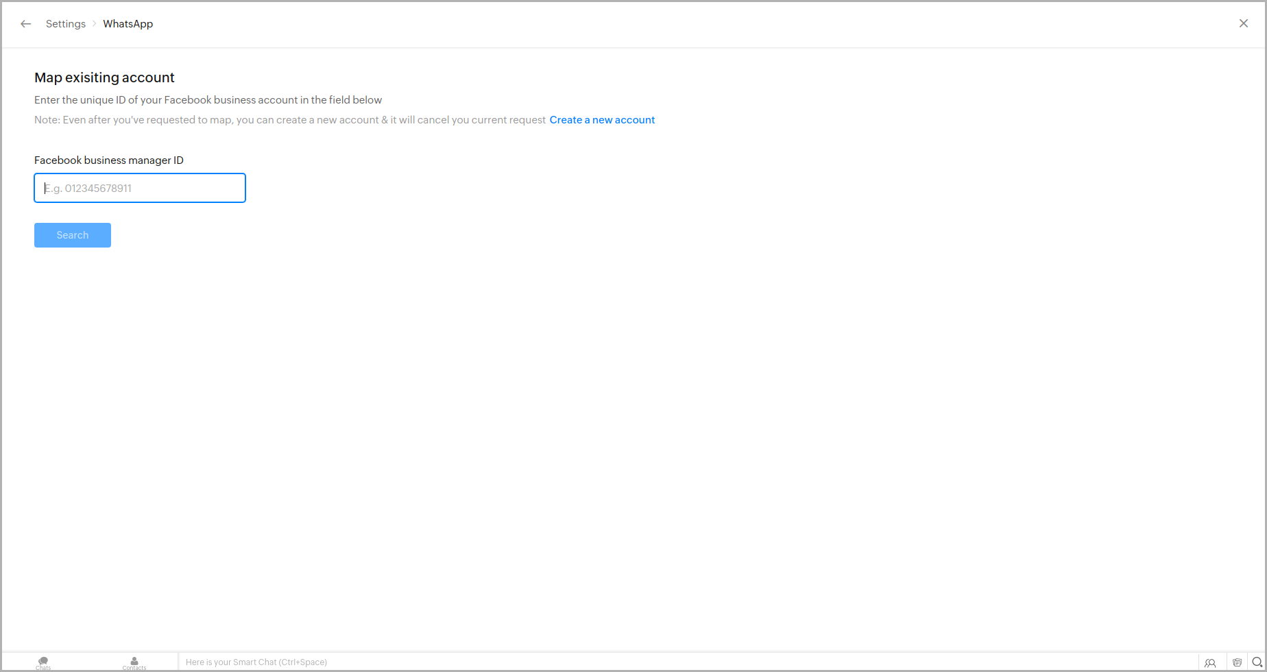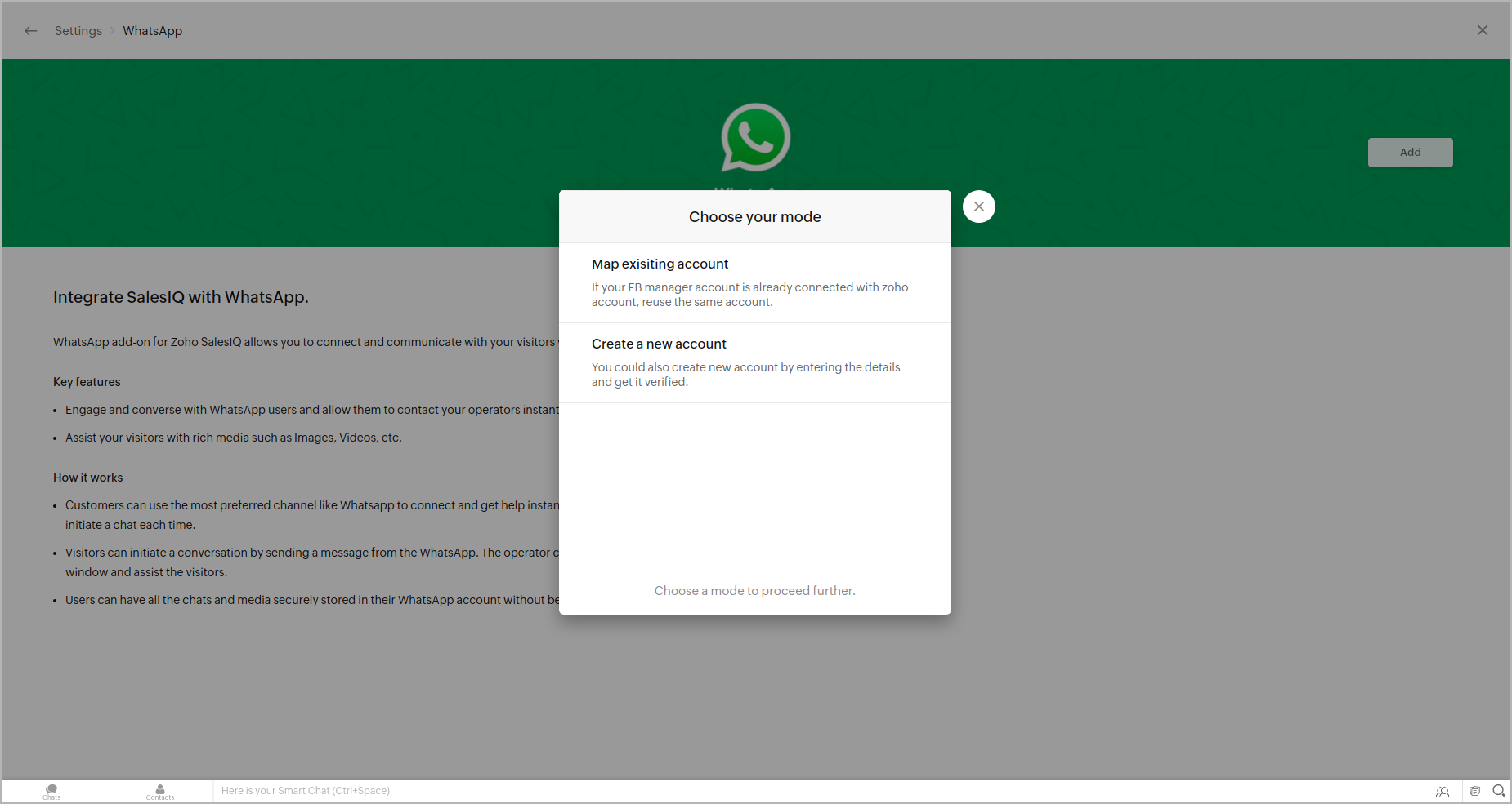 - WhatsAppを連携するには、FacebookビジネスマネージャのアカウントをZoho SalesIQと連携する必要があります。連携には、2つの方法があります。