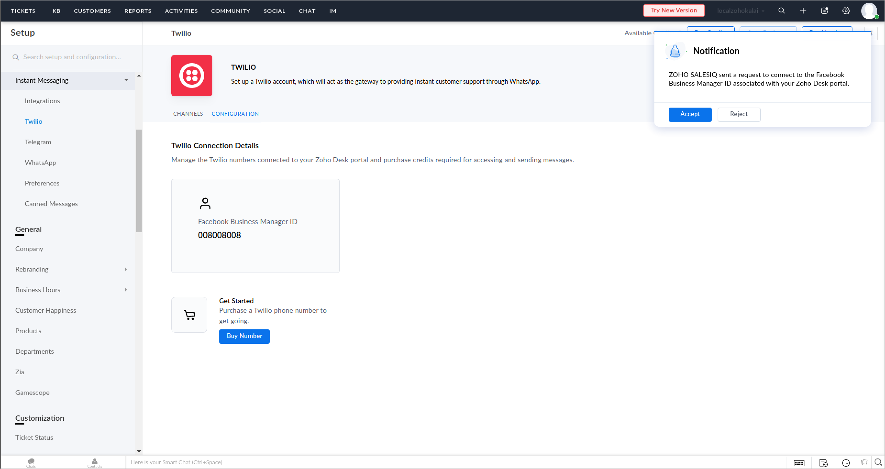 Twilioを通じてWhatsAppと連携する機能については、有効化の新規申請の受け付けは現在行われていません。代わりに、Zoho SalesIQとWhatsAppを直接連携する機能が開発中で、ベータ版が提供されています。なお、Twilioを通じてWhatsAppと連携する既存の機能を利用している場合は、そのまま利用できます。