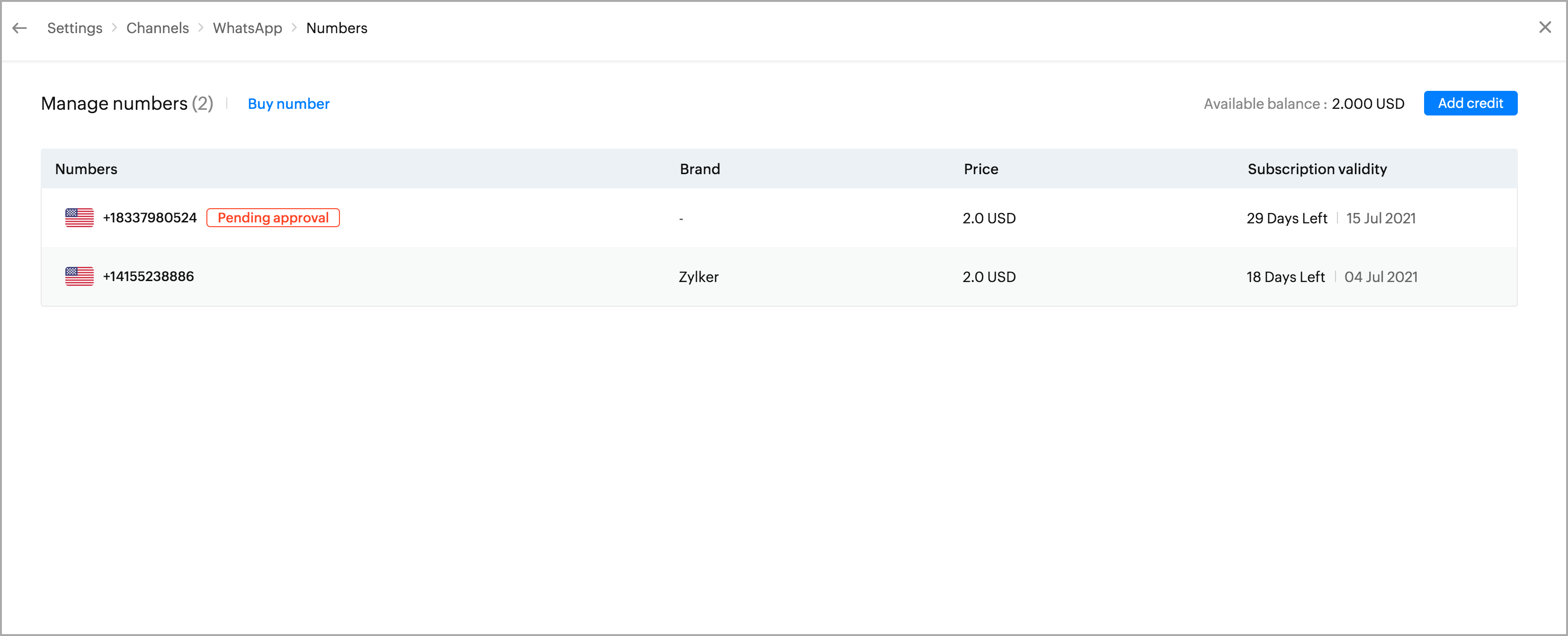 5. Twilioチームによる詳細情報の認証が完了し、承認されると、タグは[申請承認済み]に変更されます。また、[番号を購入する](番号を購入する)欄の[購入する]ボタンが有効になります。WhatsAppとZoho SalesIQのブランドを連携するための電話番号を、Twilioから購入できます。