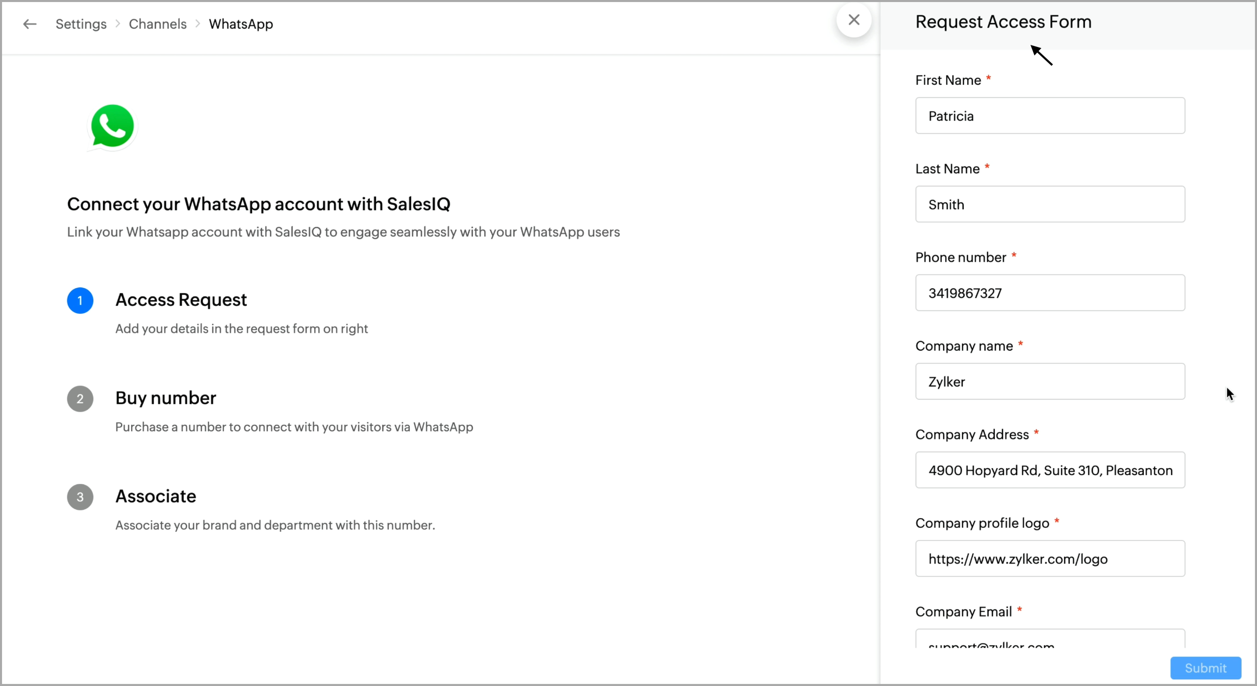 - WhatsAppアカウントとZoho SalesIQアカウントの関連付けの設定画面が表示されます。[アクセスを申請する]の欄で、画面右側に[アクセス申請フォーム]が表示されます。フォームに必要な情報を入力します。入力された情報がTwilioチームに共有され、ビジネス用の電話番号の購入申請が行われます。