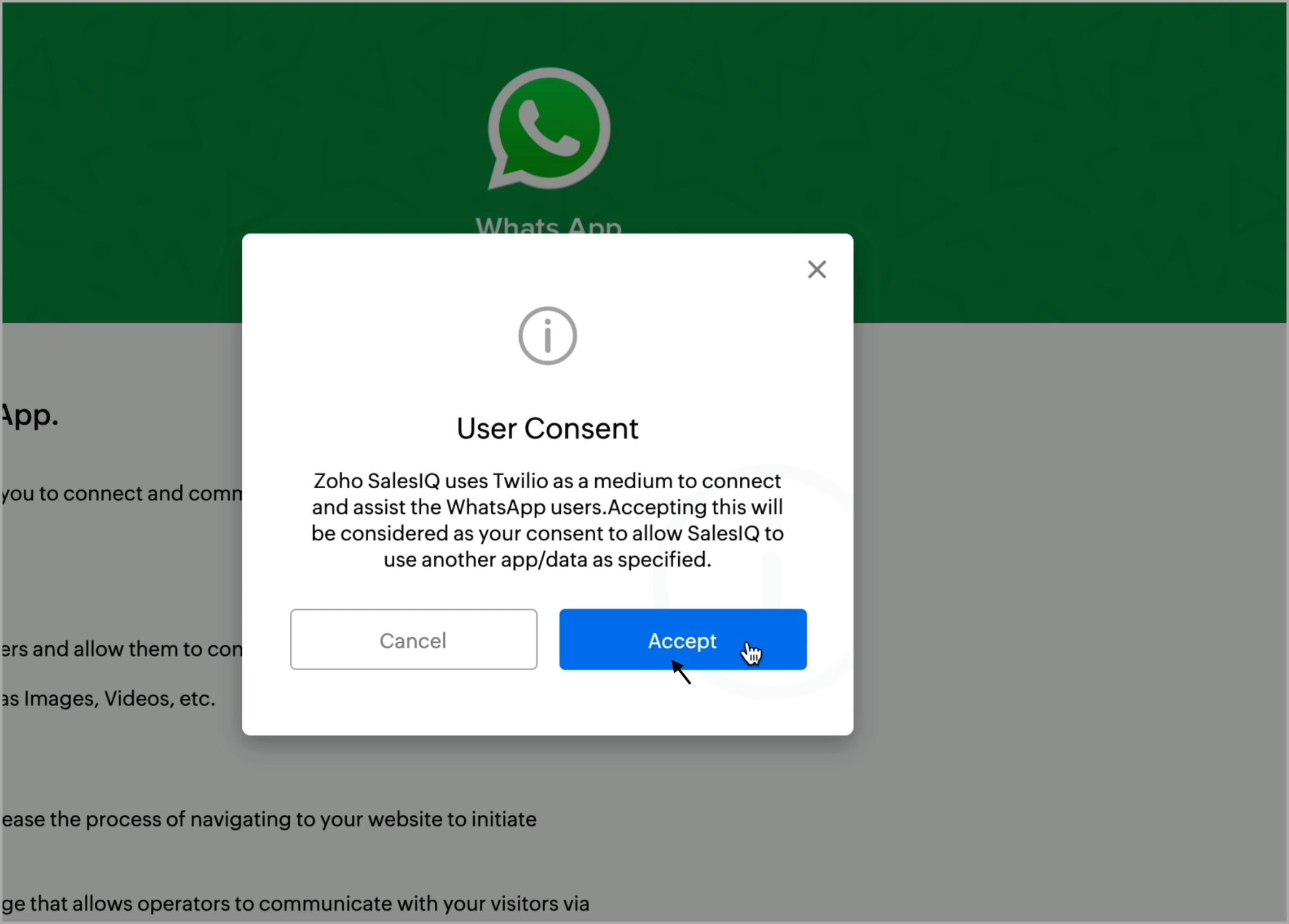 - Zoho SalesIQとWhatsAppの連携は、Twilioを通じて行われます。[ユーザーの同意]画面で[承諾する]をクリックすると、Zoho SalesIQとWhatsApp連携の仲介サービスとしてTwilioの使用を許可したものと見なされます。