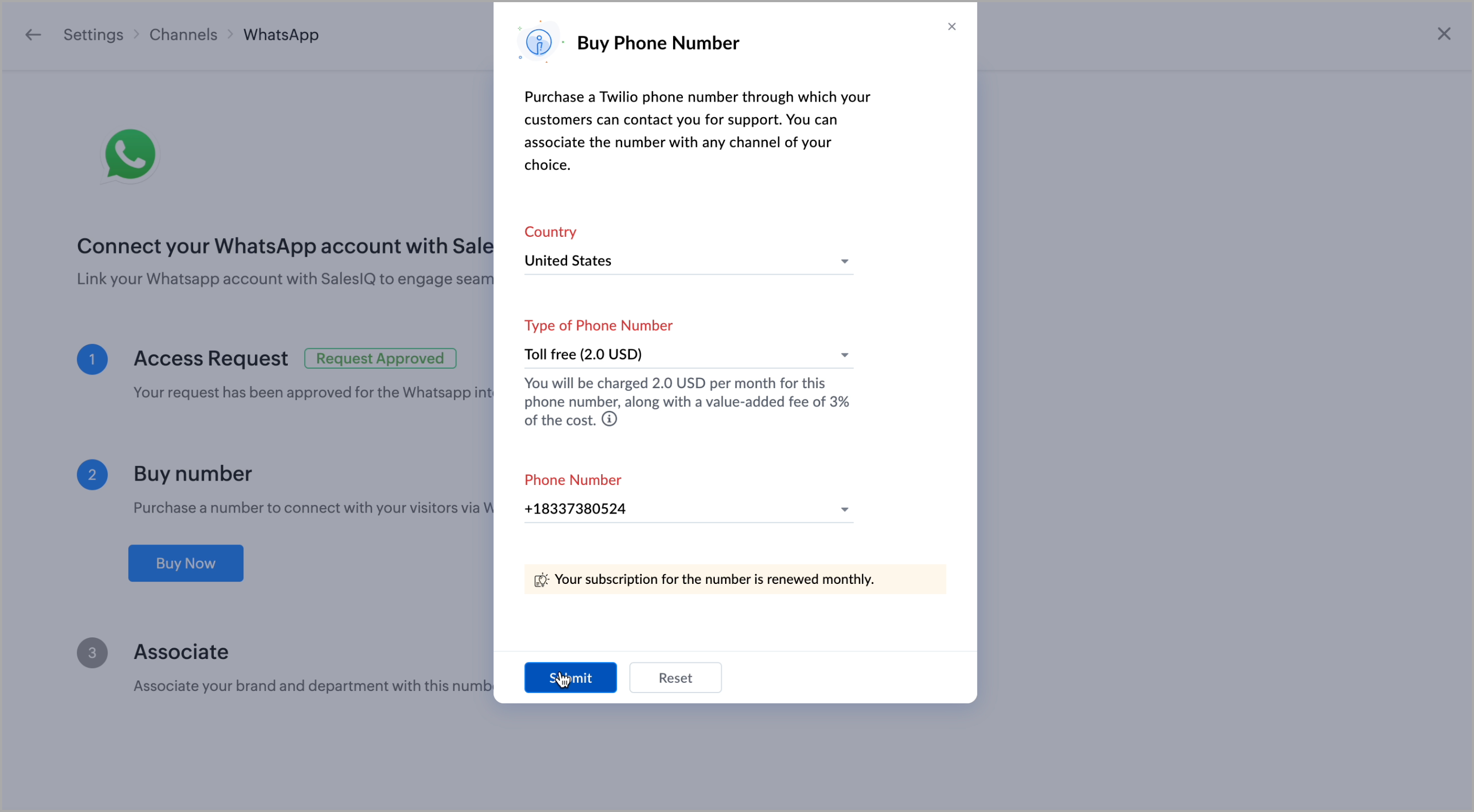 現在のところ、WhatsAppビジネスアカウントの電話番号をZoho SalesIQに関連付けることはできません。 [電話番号]項目に入力された電話番号は、ビジネスアカウントの認証のための連絡に使用されます。この電話番号は、連携に使用される電話番号ではありませんのでご注意ください。別途、Twillio経由で電話番号を取得し、その電話番号を使用してWhatsAppで顧客とやりとりする必要があります。