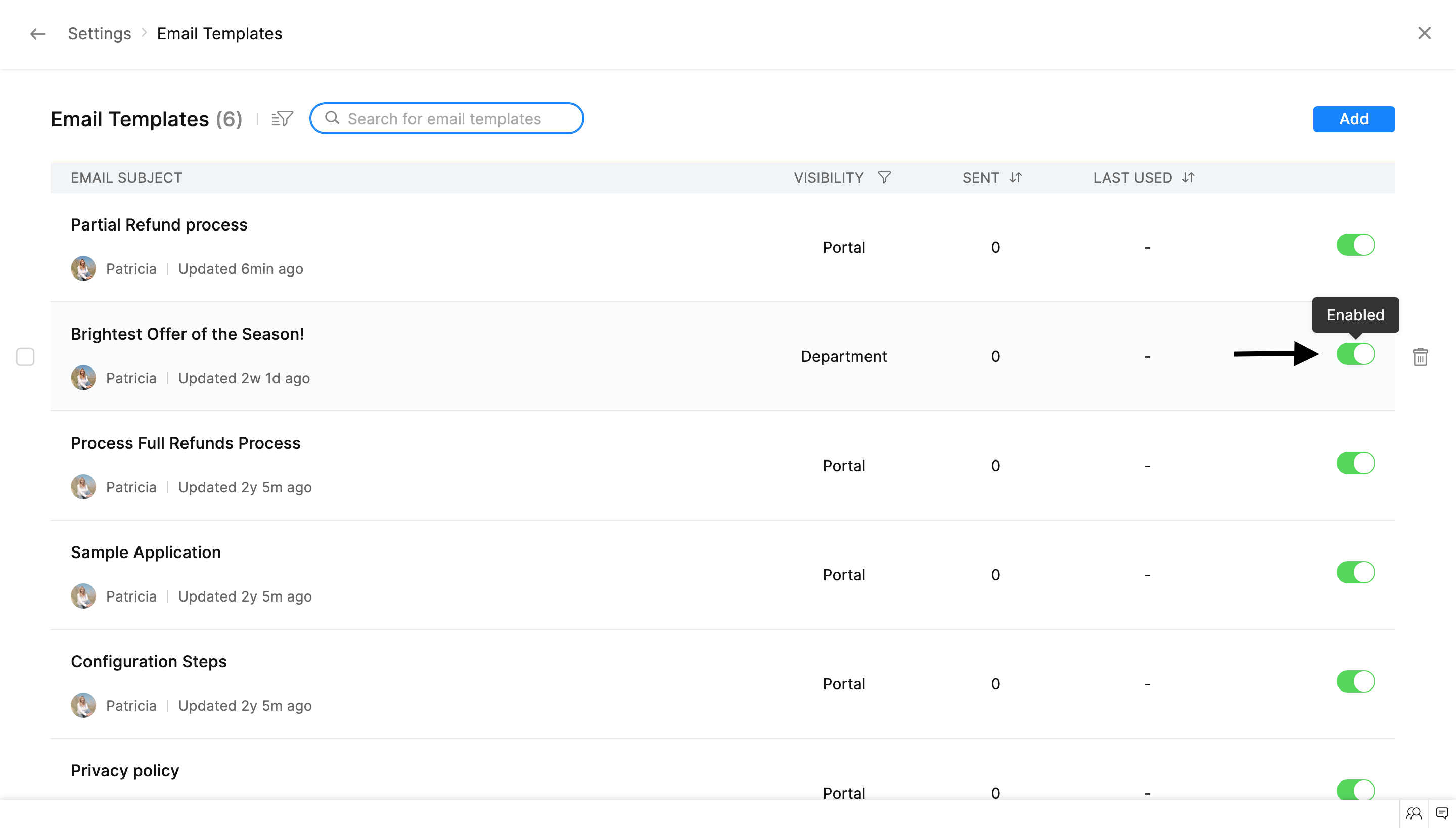 3. 各メールテンプレートの右側近くに表示されている切り替えスイッチをクリックすると、テンプレートを有効または無効にできます。