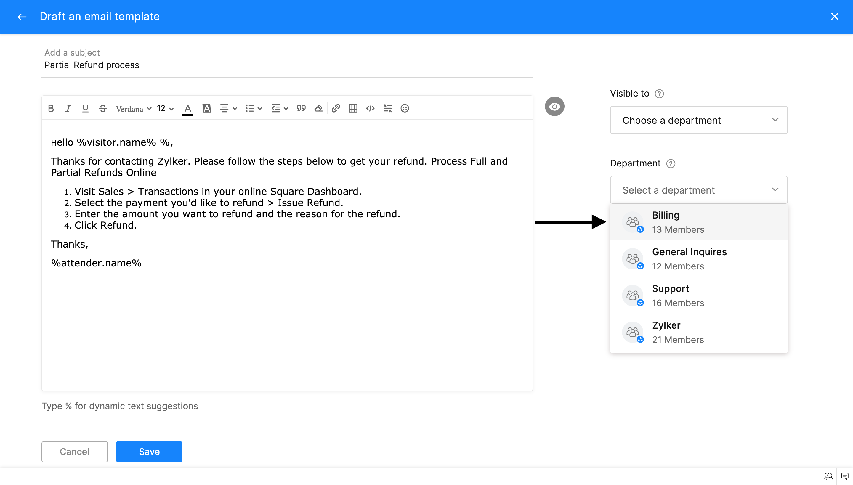 組織に関する詳細情報や組織のロゴやお気に入りアイコンを追加して、Zoho SalesIQポータルをカスタマイズできます。追加した組織情報は、担当者が必要に応じて参照したり、訪問者に対して組織情報を伝えたりする際に役立ちます。チャットの定型返信やメールテンプレートに差し込むことも可能です。  組織のロゴの変更: [設定]→[一般]→[組織情報]に移動し、組織名の横にあるロゴ画像をクリックします。 [アップロードする]をクリックして、組織のロゴを選択します。  組織の基本情報の追加または編集: ...