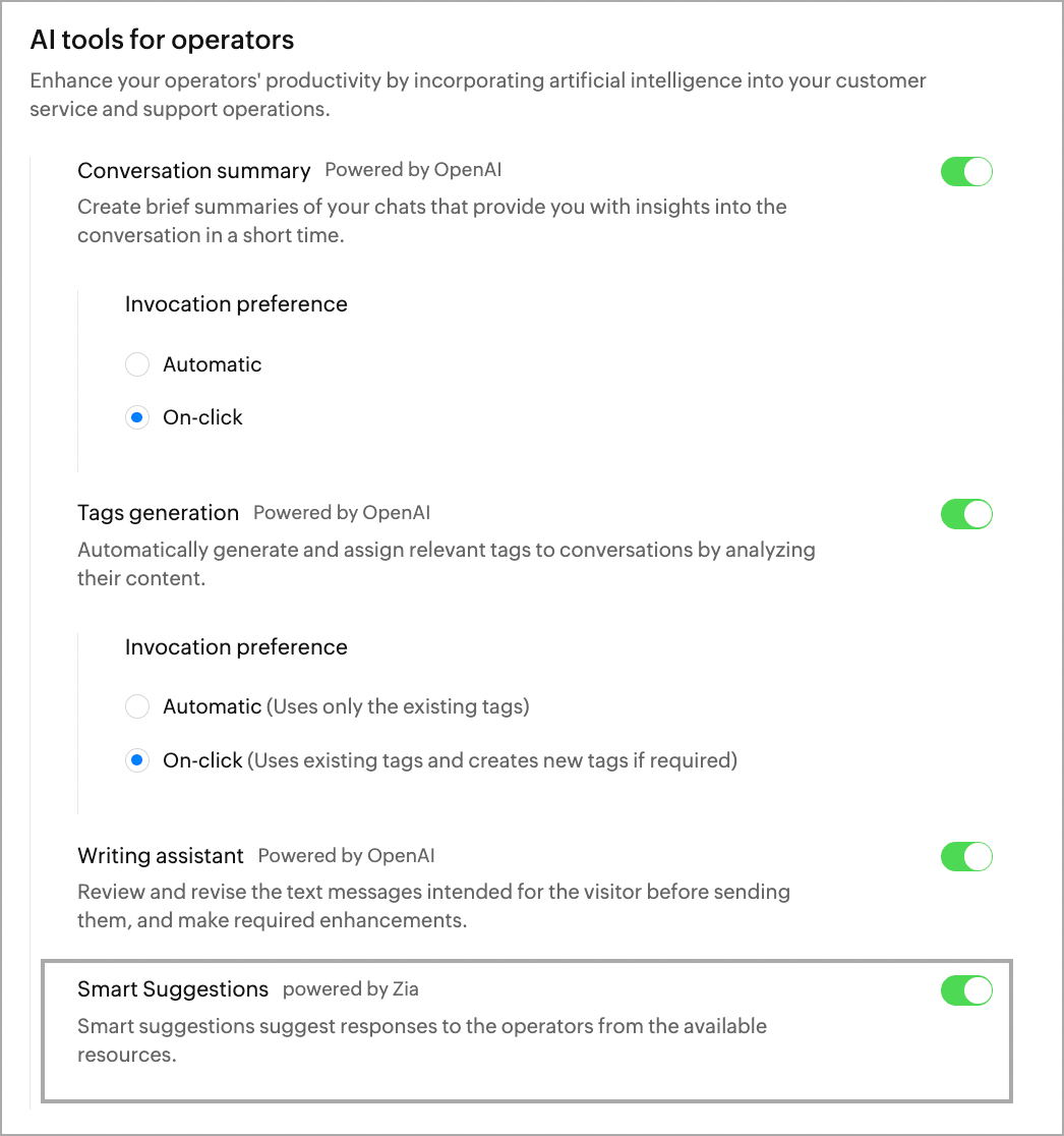 1. [設定]→[カスタマイズ]→[共通設定]→[担当者の画面]→[担当者向けのAI機能]→[案内候補の表示]に移動し、スイッチをオンにします。