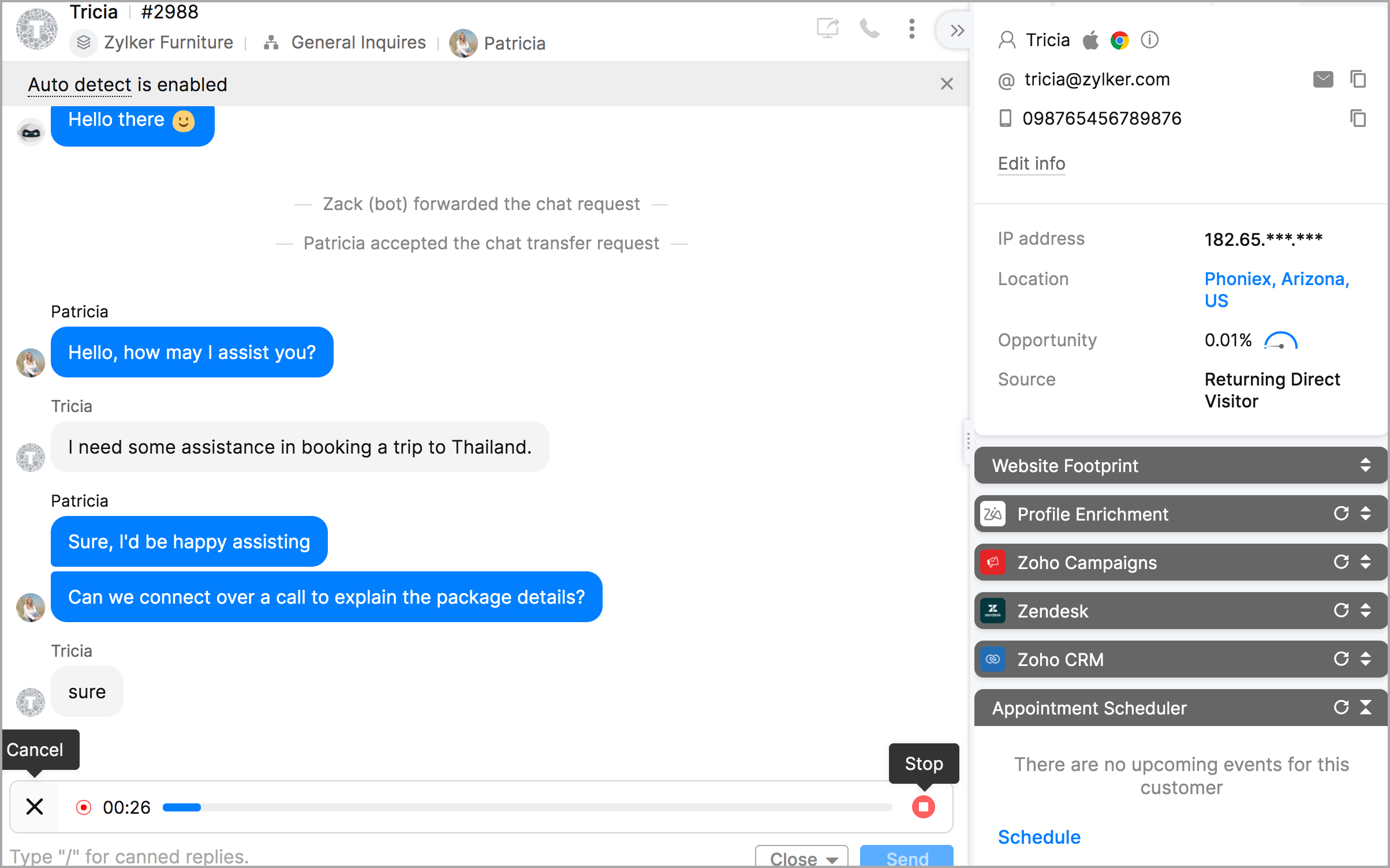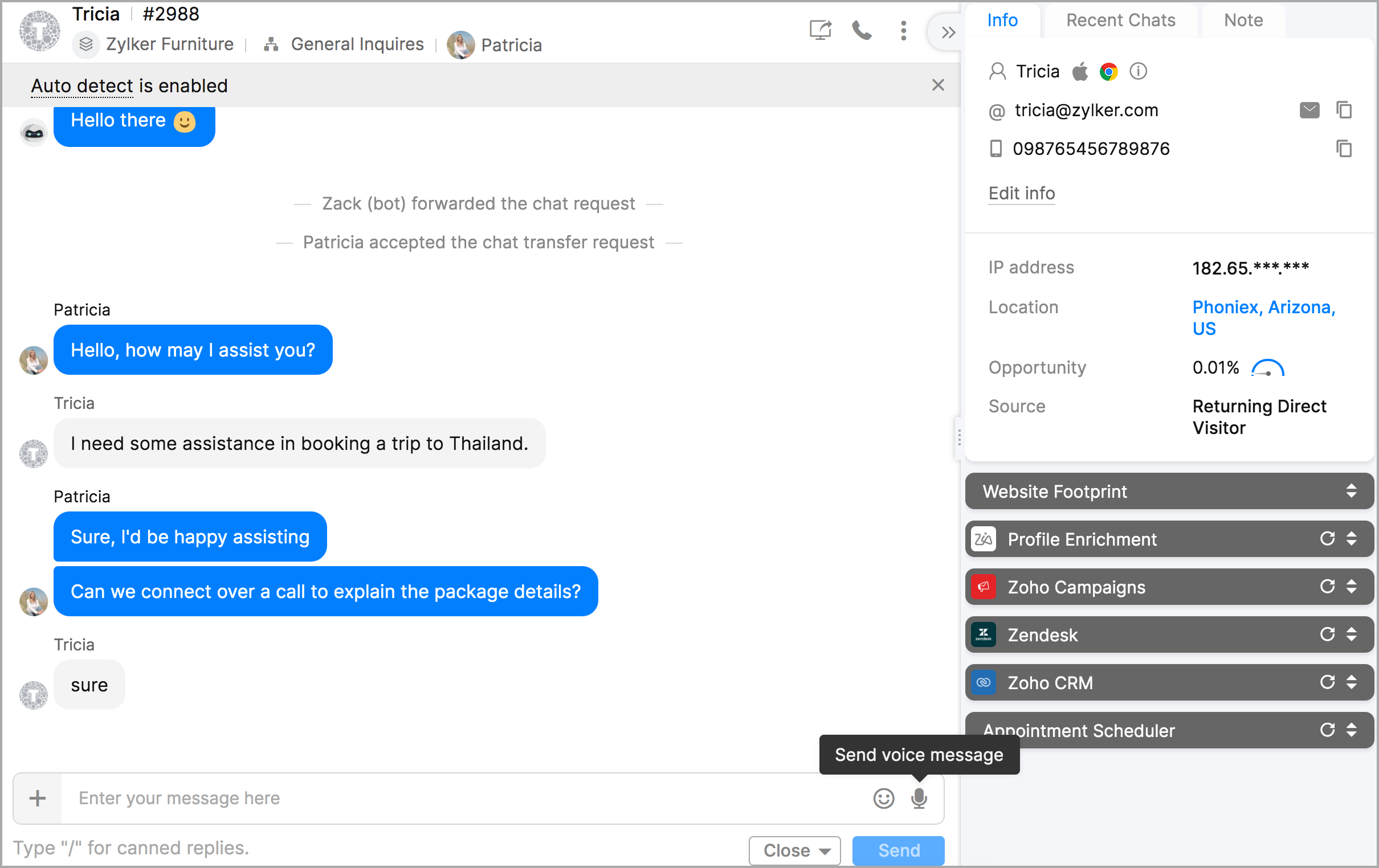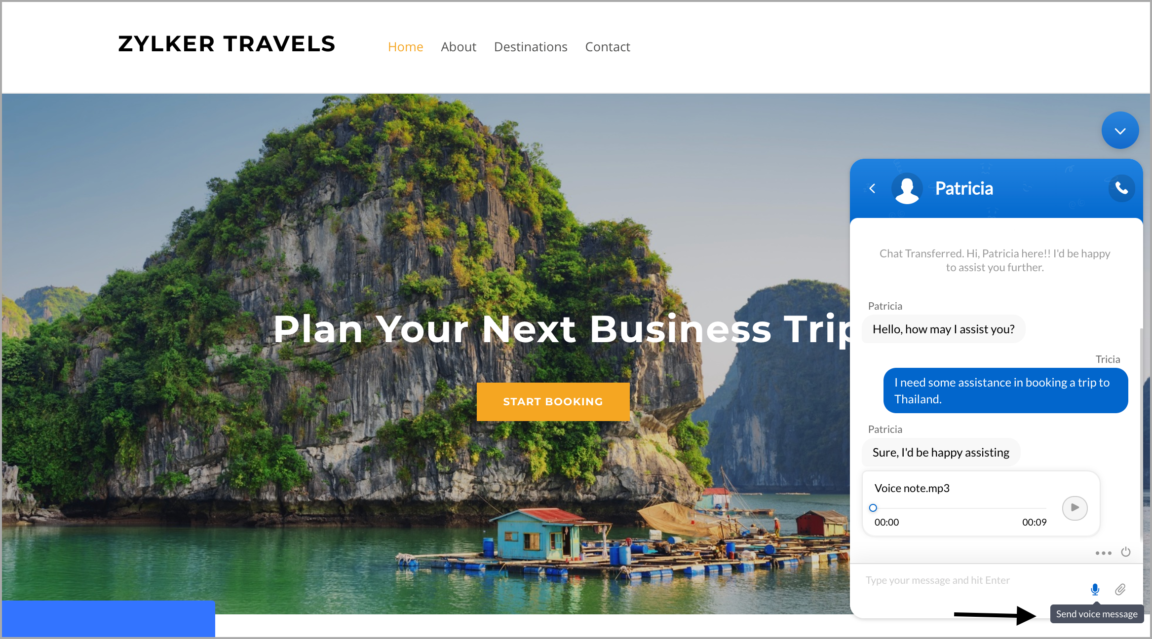 1. 担当者はチャットウィンドウから直接、テキストの代わりに音声メモを送信できます。